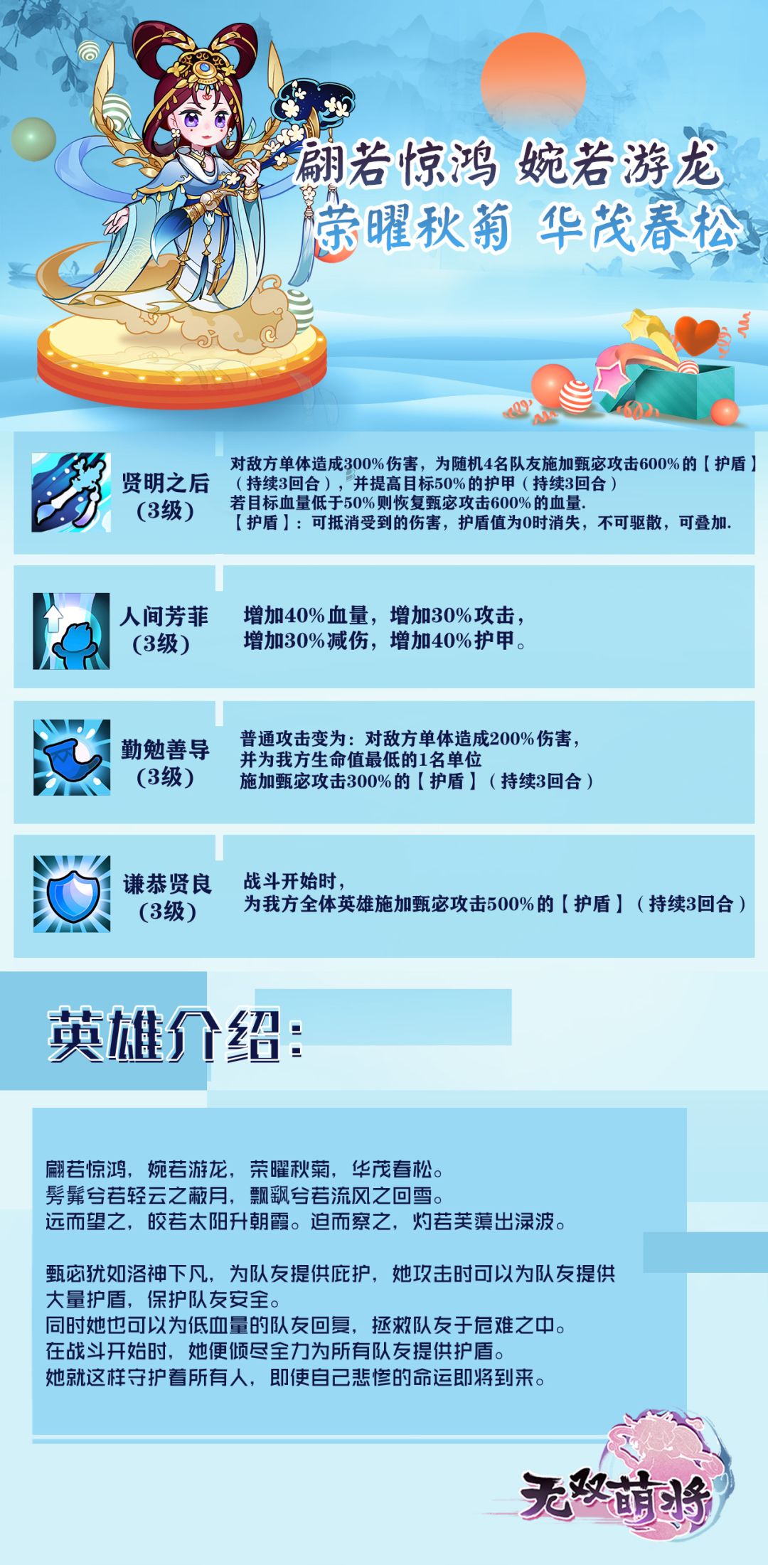 各位亲爱的萌主: 您好! 《无双萌将》在各位萌主的陪伴下即将迎来了第三十周的固定更新。 本周的版本活动时间为:7月2日00:00—7月8日23:59:59。我们一起来看看本周的版本更新内容吧。 【新增版本内容】 1、新增鬼系英雄——甄宓; 2、火羽商店增加英雄——小青; 3、上级5星角色魂魄、上级5星妖魂魄增加英雄——小青; 3、名将自选箱英雄更新; 4、新增金銮皮肤——醒狮舞动; 5、火羽商店新
