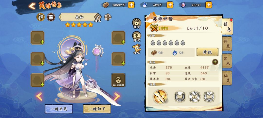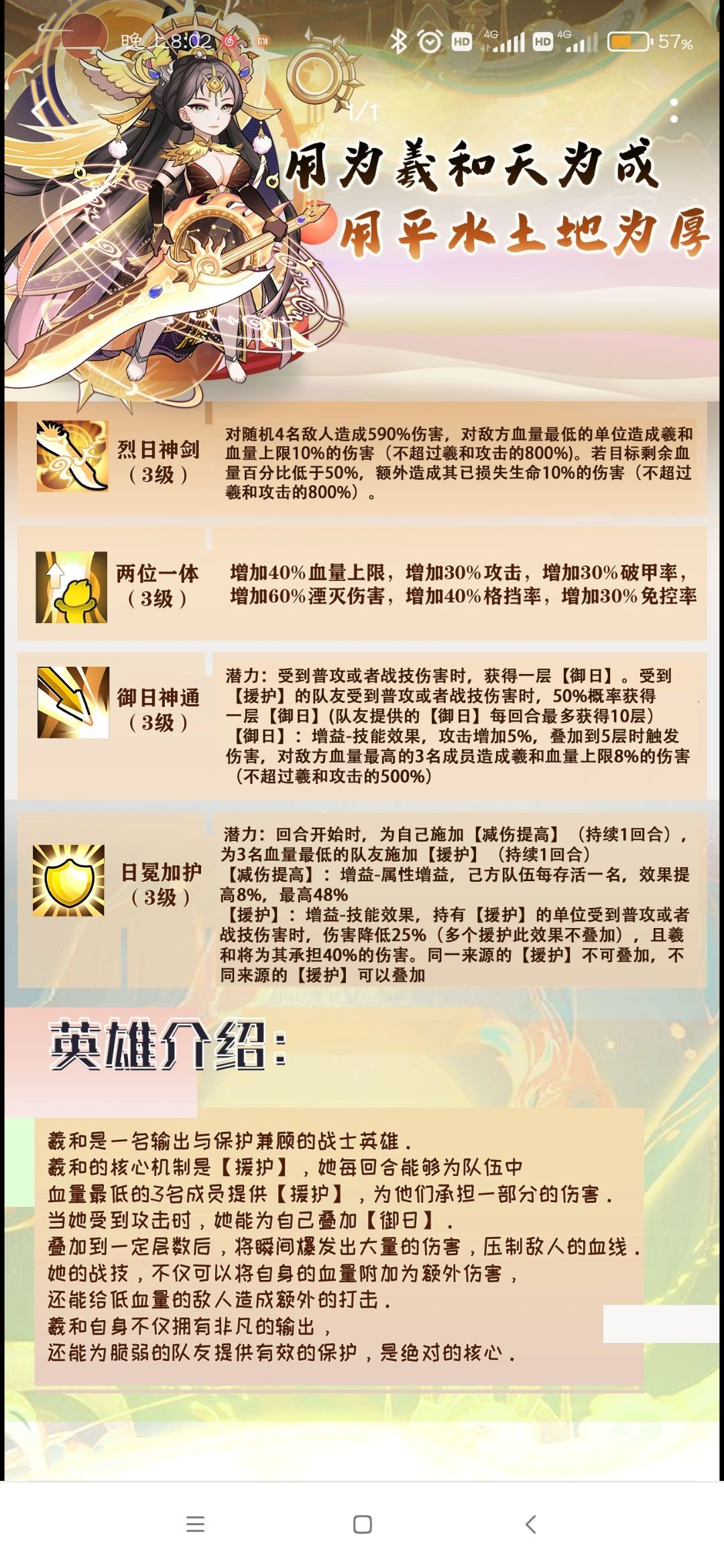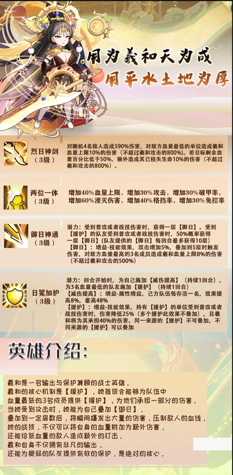 羲和,最近新出的神,官方的定位是能保护能输出的大c。 核心技能“援护”,每回合对血量最低的3名成员提供保护,降低其受到的25%伤害,承担其40%伤害。援护的同时还能触发御日,相当于自带反甲,不受祝融嘲讽影响。 首先,最新做的神,其四维肯定不差。 基础1975的速度,让其能够比最近的硬控诸葛和师师都快。基础接近600万的血目前也是所有武将中最高的,所以羲和面板还是很硬的。 技能方面,首先看被动技能 增
