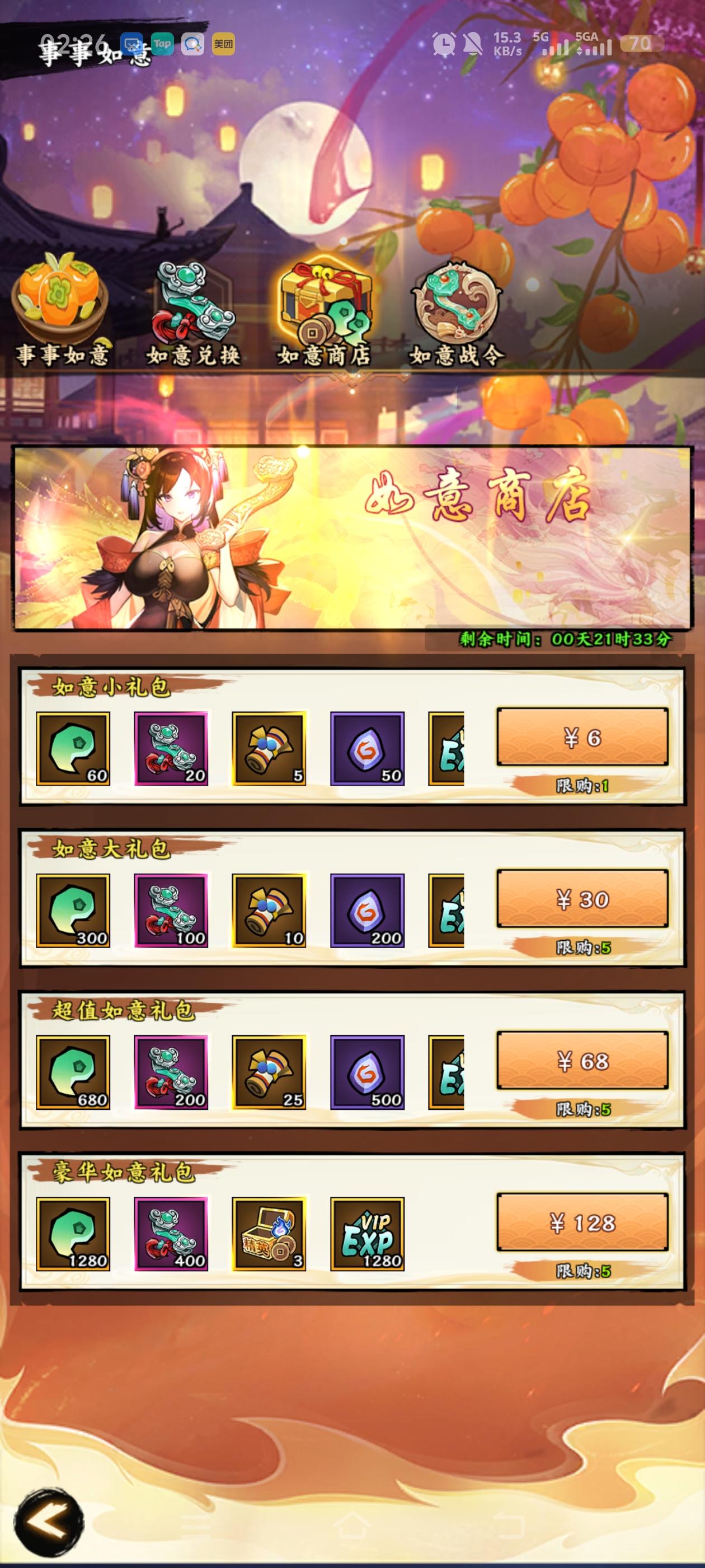 大家新年快乐活动期间每天充值30元,一天可以获得115如意,玩小游戏“搞个大的”一天15个7天刚好805 再充值30×4=120+128=248元248+7×30=458元其实你这7天都买的30鲨鱼券的礼包(如意商店礼包可以用鲨鱼券买)你只用花210元就能拿一把神器或者星宿宝石大家错过了没关系,类型活动后续还会出的比如下周的盖章和节庆月卡常驻了当然无双也一直在研发新活动和玩法大家