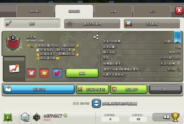 部落招人✨服务器:国际服✨部落名称:秋光锦✨部落等级:8级✨部落都城:十都科技全满✨部落标签:#2J9VCYL0R✨部落福利:联赛有专属部落壳子,有奶号!✨半竞技半养老部落,部落战红牌不打,绿牌必需出刀欢迎新老玩家加入,任何本数都收!只要活跃就行🎉