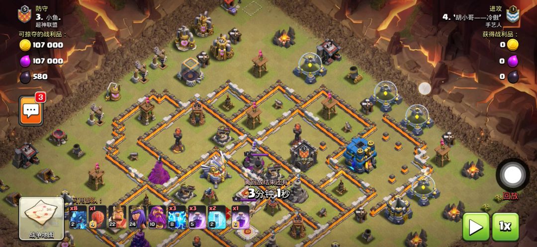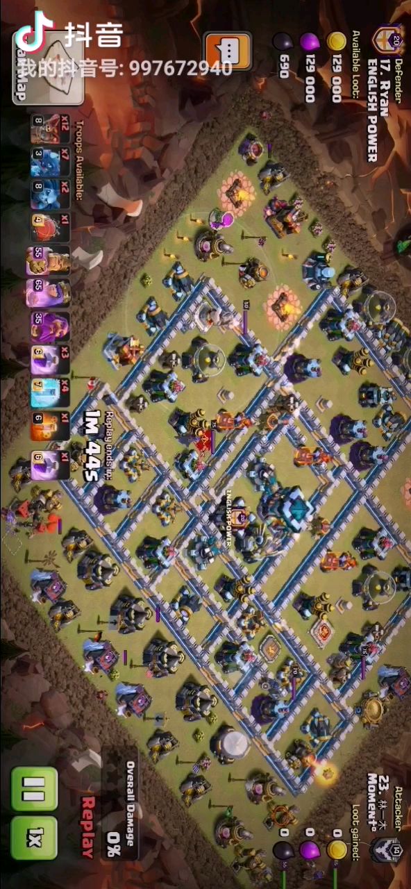 兵种;5天使 1龙宝 2气球 1电龙 2超炸 5雪怪 8蓝胖 3哥布林 3弓箭 。 打法;天永清理一角,飞艇清理一角,大部队进中。