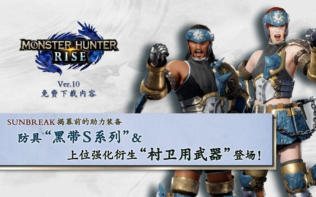 CAPCOM 游戏将向猎人们赠送强力的防具,有助各位快速推进《怪物猎人崛起》的本篇进度,更早享受到 曙光的全新狩猎体验。 开始游戏后,可以从「邮差千里」处领取追加装备「黑带 S 系列」! 防具「黑带 S 系列」 能够抵御进阶魔物的攻击,防御力高至 330!生产及装备装饰品还可进一步增强防御力。 「14 种村庄守卫武器」 我们将会为已于《怪物猎人崛起》发布的「14 种村庄守卫武器」追加进阶强化衍生! 取得支持装备,完成集会所★7 的任务「雷神」,在《曙光》世界中展开旅程吧! #CAPCOM #怪物猎人崛起