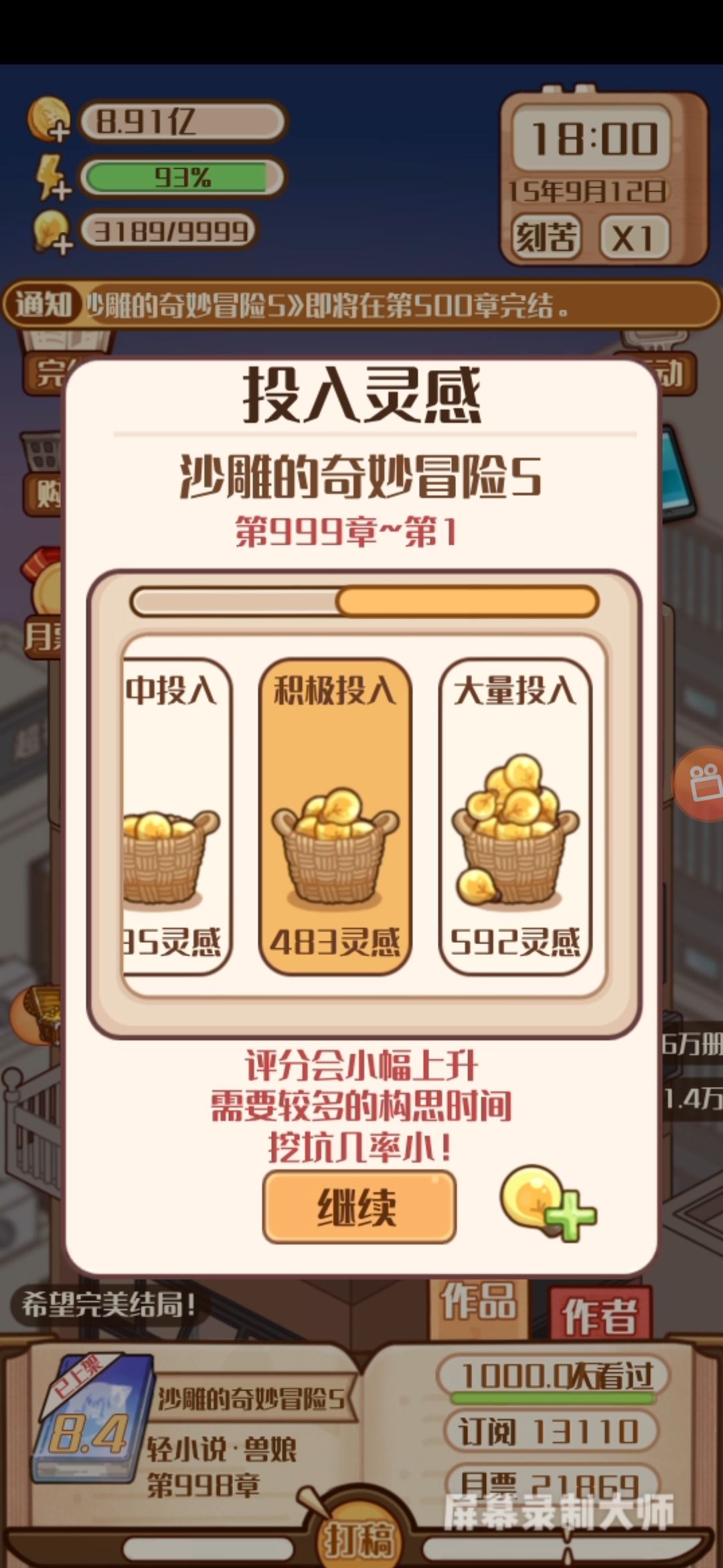 实际上需要看的广告没那么多,当然这个需要积累游戏的理解:转盘在传家宝道具满之前优先看,然后是题材升级(只升爱情相关题材,涨粉快),学习(优先级自上而下,主打涨粉涨钱),剩下的就只有突发事件值得看广告 。 优化:除了初期需要看一下灵感,后期所有的灵感活动根本都不需要了,写作只选双推进,虎躯一震,灵感投入按照每本书的初始评分投入2到20章,剩下的全用中等投入,灵感只靠溢出体力打工(左边不看广告的选项,