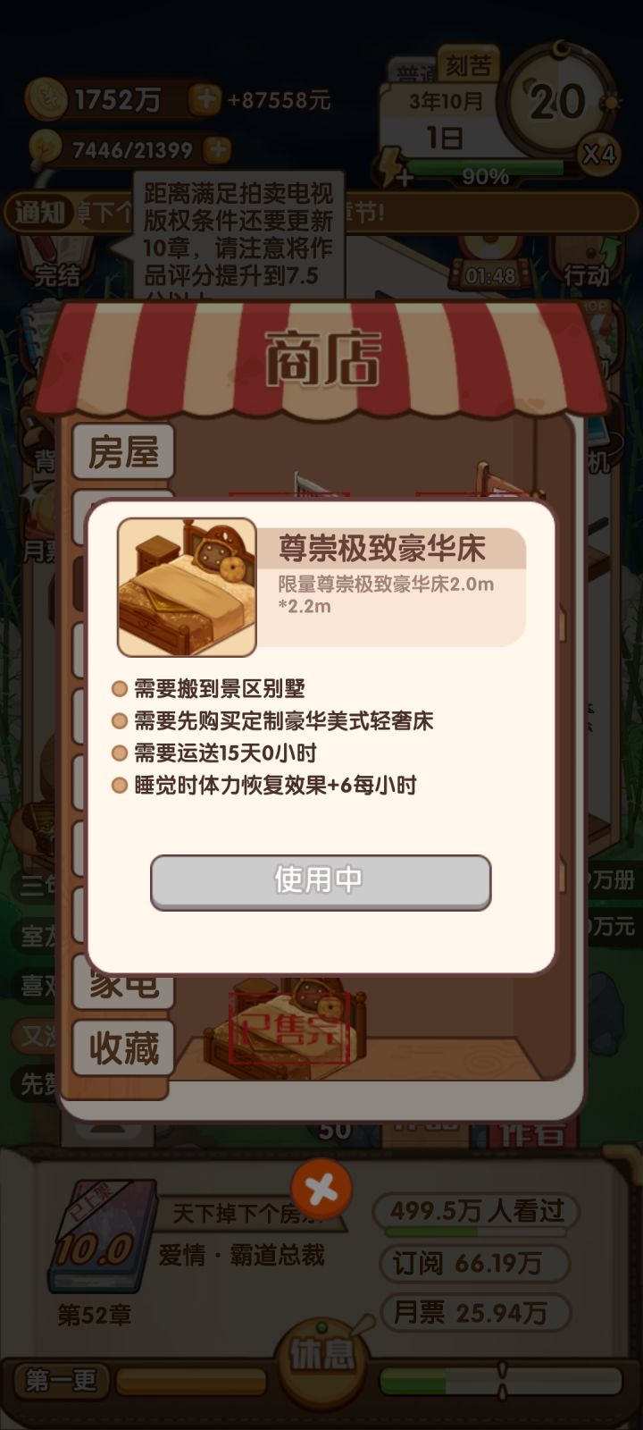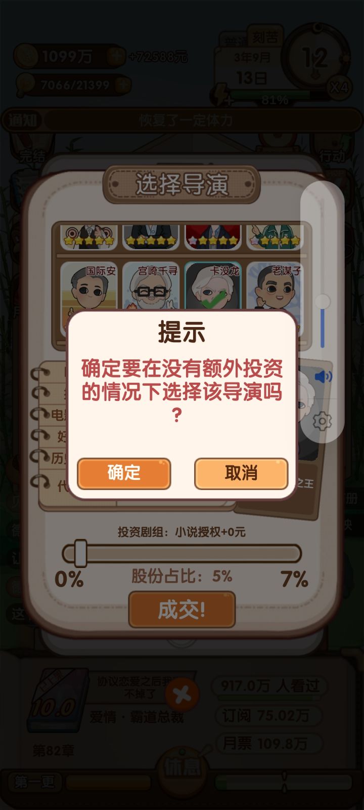 有的要看广告都懒得看。前面怎么拉那些导演都升不了星。我感觉升星的条件应该是星级和票房的数量有关吧。因为有一次没有突破票房记录也升星了。基本上都是后期。粉丝量和订阅量还有策略带动票房数的。跟导演没有什么关系。虽然说买房不值,但是想体验收租。已经到总统套房了。有点不太想买总统套房等以后有钱再买吧,先升级一下题材和写作能力先。以后看机会再去买那个2亿的别墅吧,