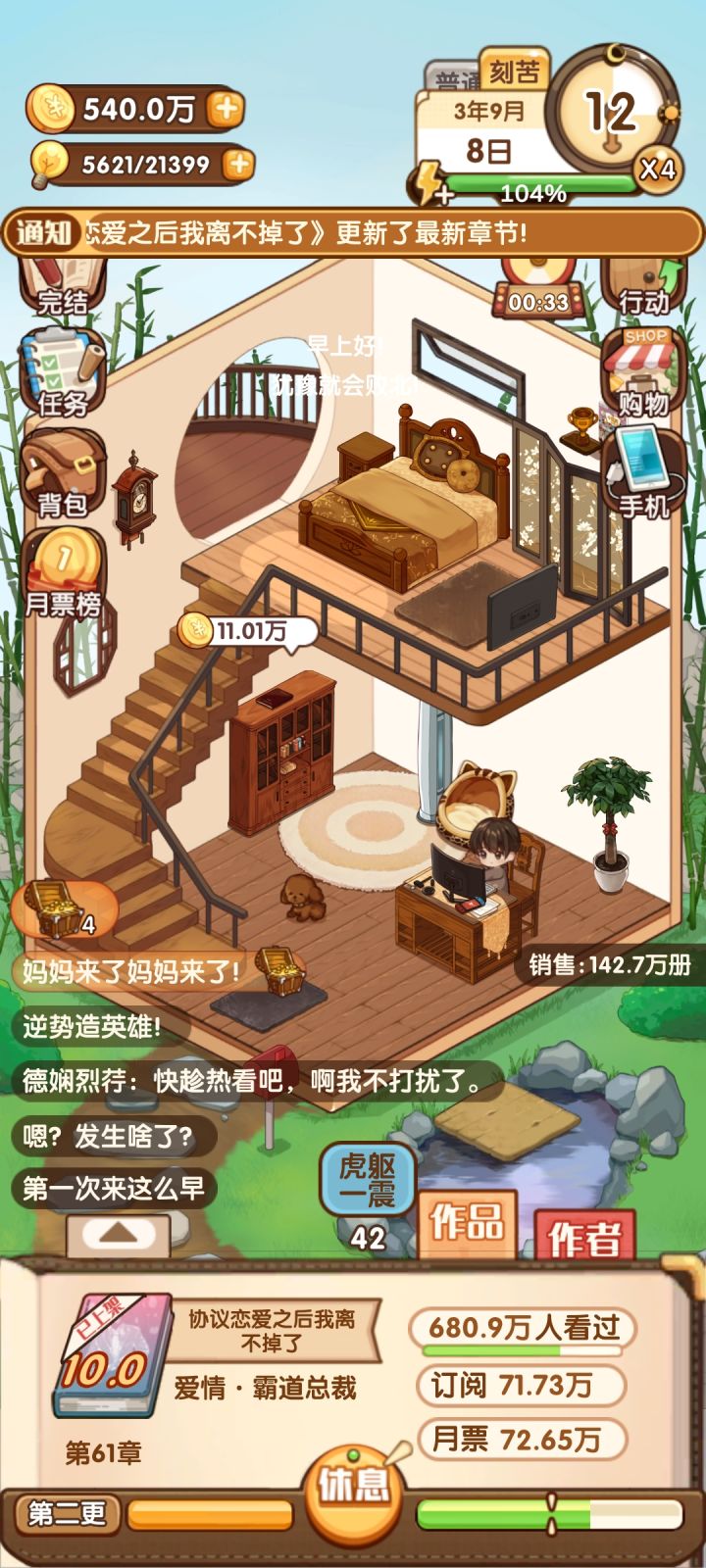 游戏分为新手模式和进阶模式两种,攻略通用,以下攻略以进阶模式为主。 进入进阶模式开第一部小说,上传后点击休息,先不要进行任何创作。 先用初始的钱升级属性,钱不够就去打工,把每项创作属性提高到50以上解锁二级打工。 然后用二级打工把能买的家具全买了,把灵感提高到400左右,可以写第一部小说了。 写小说有两个模式,第一个是流水线小说模式,也就是两个推进+虎躯一震,快速推进小说进度快