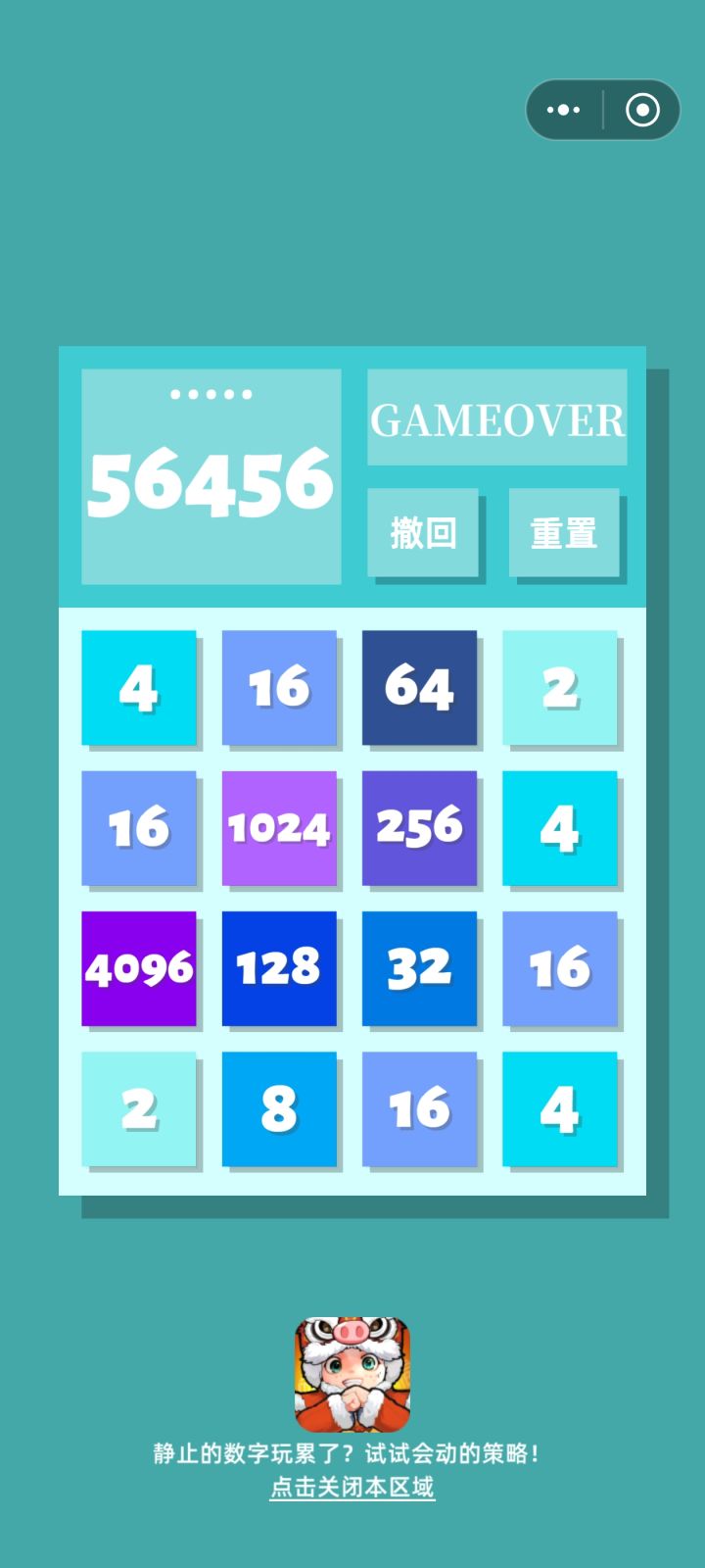 历时一个月达成的GAMEOVER说实话还有点舍不得,这一个月里每天闲下来就会打开2048划拉两下,似乎已经成了习惯,每天不玩就感觉少了点什么,现在不知道按下重置键后看到那一片空旷会是怎样的心情呢或许以后也不会再玩这个游戏了,因为这一把给我带来的感触很多,以后应该是不会再能体会到那时的心情了,不管怎样谢谢这一个月的陪伴啦