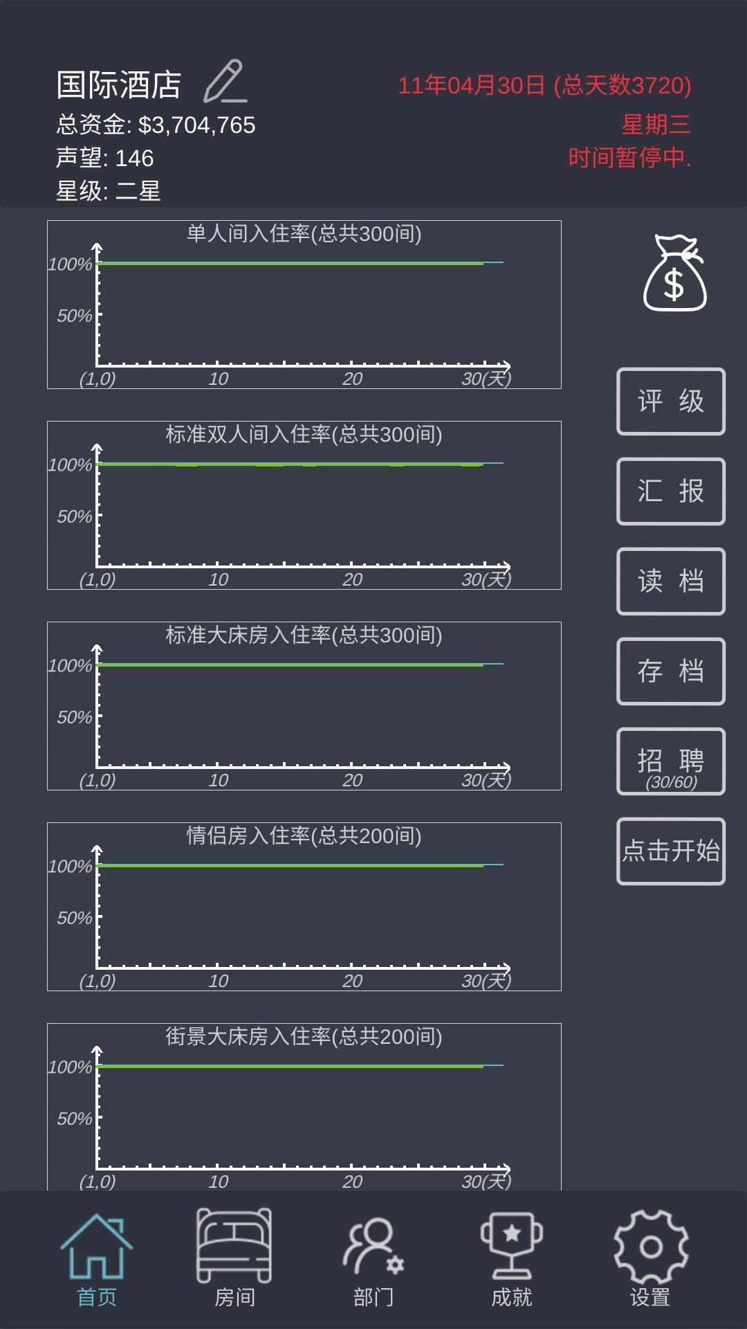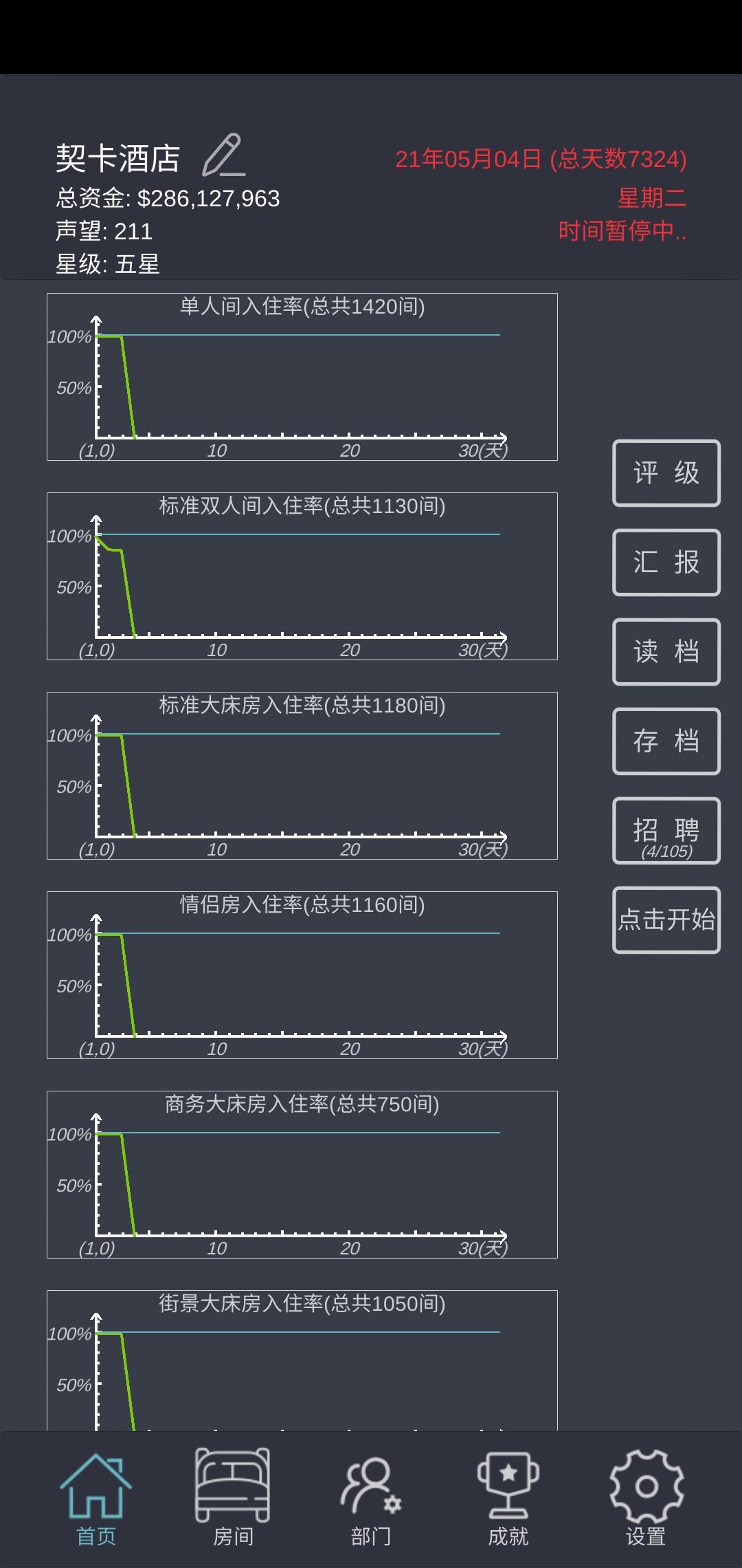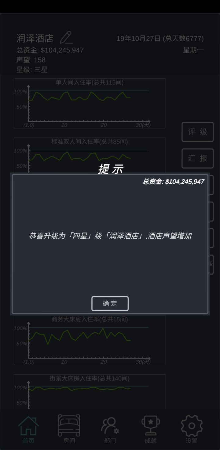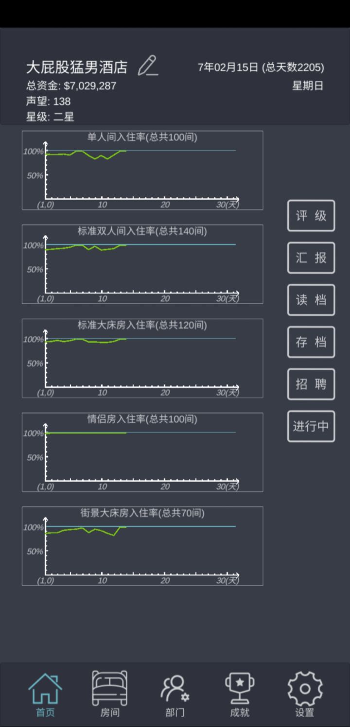直接正文:1、三星级之前只要已开的四种房型!2、直接招人!直接招人!直接招人!不要培训!(三星后可以稍微培训几次)3、房型不着急升,一直扩建就行了!线形图全月住满呈直线——升级3-4星后开了新房型没客户——升级总统套房四星后建——1间房直升5级(快升五星时候扩建,需要的钱较多,酌情扩建)4、繁忙度不要超过百分百,不然触发各种扣声望事件,最好控制在90以下;酒店升星前控制在80以下,多