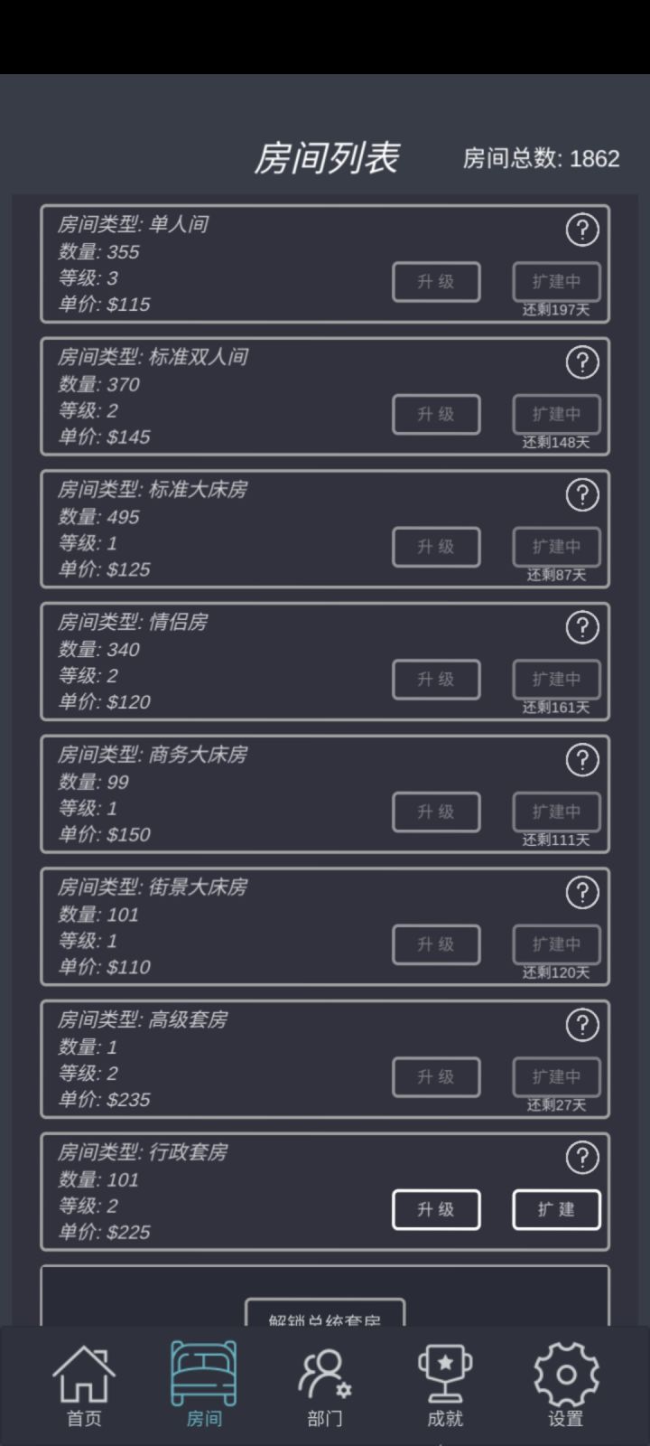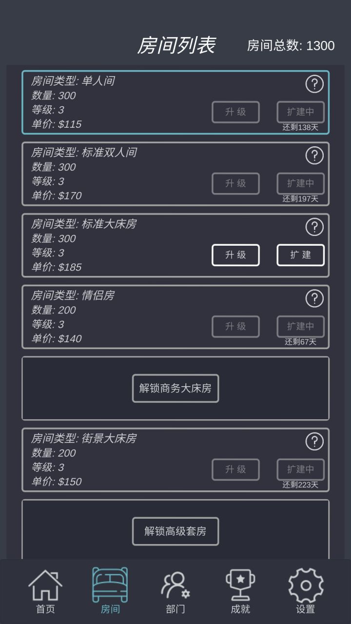 1.前期四种房间就行,后面入住率太低2.前期不要升级房间,导致扩建又贵又慢3.一次扩建越多越划算,最好max100个4.前期可以10个10个,或者20过度5.房间一千多后,员工也多,收益并不明显了6.员工的能力差别不大,主要还是看部门7.总统房等阶段四,升到五级再升阶段五(据说维护太贵)才玩一天,欢迎大家补充