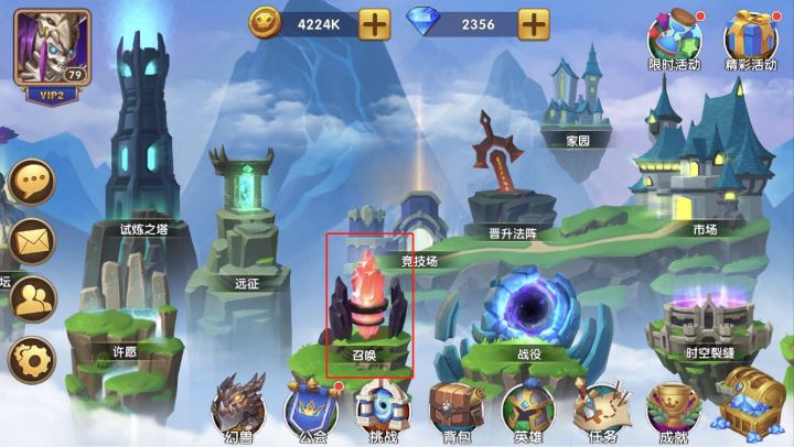 《巨龙之戒》中英雄召唤功能,是游戏一开始就开放的功能,没有任何等级限制,入口在游戏主界面的红色钻石图标处,标注着“召唤”两个字。这个功能的主要作用就是召唤游戏中的英雄,一共有三种召唤方式,分别是普通召唤券召唤,高级召唤券召唤和友情点召唤。不同召唤方式获取星级英雄的概率不同,右上角的问号有注明,这里我们换一种说法来描述下,更容易让大家理解:基础召唤100次,会获得56个一星英雄,34个二星英雄