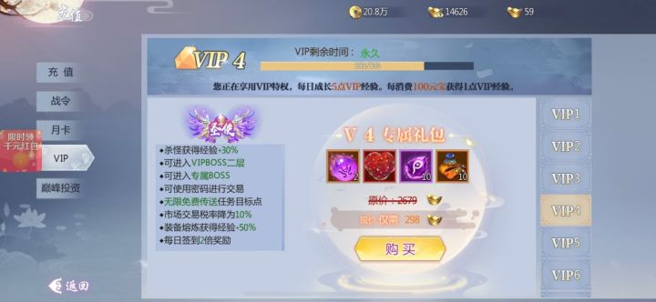 在《五行降妖师》中,元宝有分元宝和绑定元宝两种,但其实能买的东西并不差多少。比较常用的东西都可以用绑元买到,所以元宝的使用就有学问~下面小五就来为大家推荐一下元宝怎样用才比较划算。【VIP】VIP作用十分大,不仅能提高杀怪获得经验,还能降低市场税率和获得boss高层进入的权限和其他对游戏有帮助的福利。建议要开VIP就直接升VIP4,越早开VIP4获得的收益越高。要好好玩游戏,VIP是建议一定要