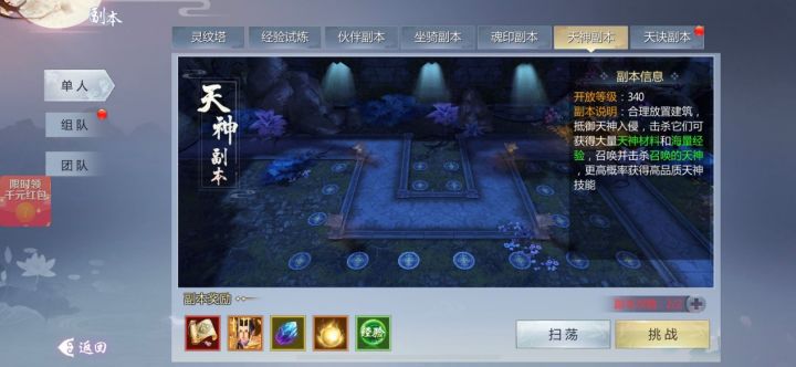 大家好呀,这里是小五,我又给大家带来新的情报啦,今天要介绍的是天神副本的玩法介绍。玩家在340级时会解锁该模式,天神副本是一个塔防小游戏,玩家在怪物行进路线两旁放置建筑,击杀怪物会掉落大量的天神材料和海量的经验。每日仅两次的挑战机会,可以使用扫荡券。小五推荐大家把建筑放置在凸角和中间道哦,这样放能充分利用建筑的攻击范围,对怪物造成更多的伤害。每击杀一个妖怪都能够获得一定的积分,每300积分能