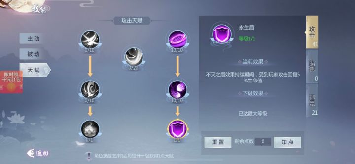 开启等级:飞升1级开启,玩家320级开启四转任务,集齐天命魂石并且升到340级可以完成四转,飞升到飞升1级,开启天赋系统。天命魂石可以通过市场、商城购买,专注升级速度的玩家不建议用经验完成四转任务,尽量通过天命魂石完成,可以获得等级优势。天赋玩法:初始开启天赋将获得10点天赋点,此后每升1级可获得1点天赋点。天赋点可用于提升天赋,不同天赋效果不同。天赋分为攻击、防御、通用3大类,攻击、