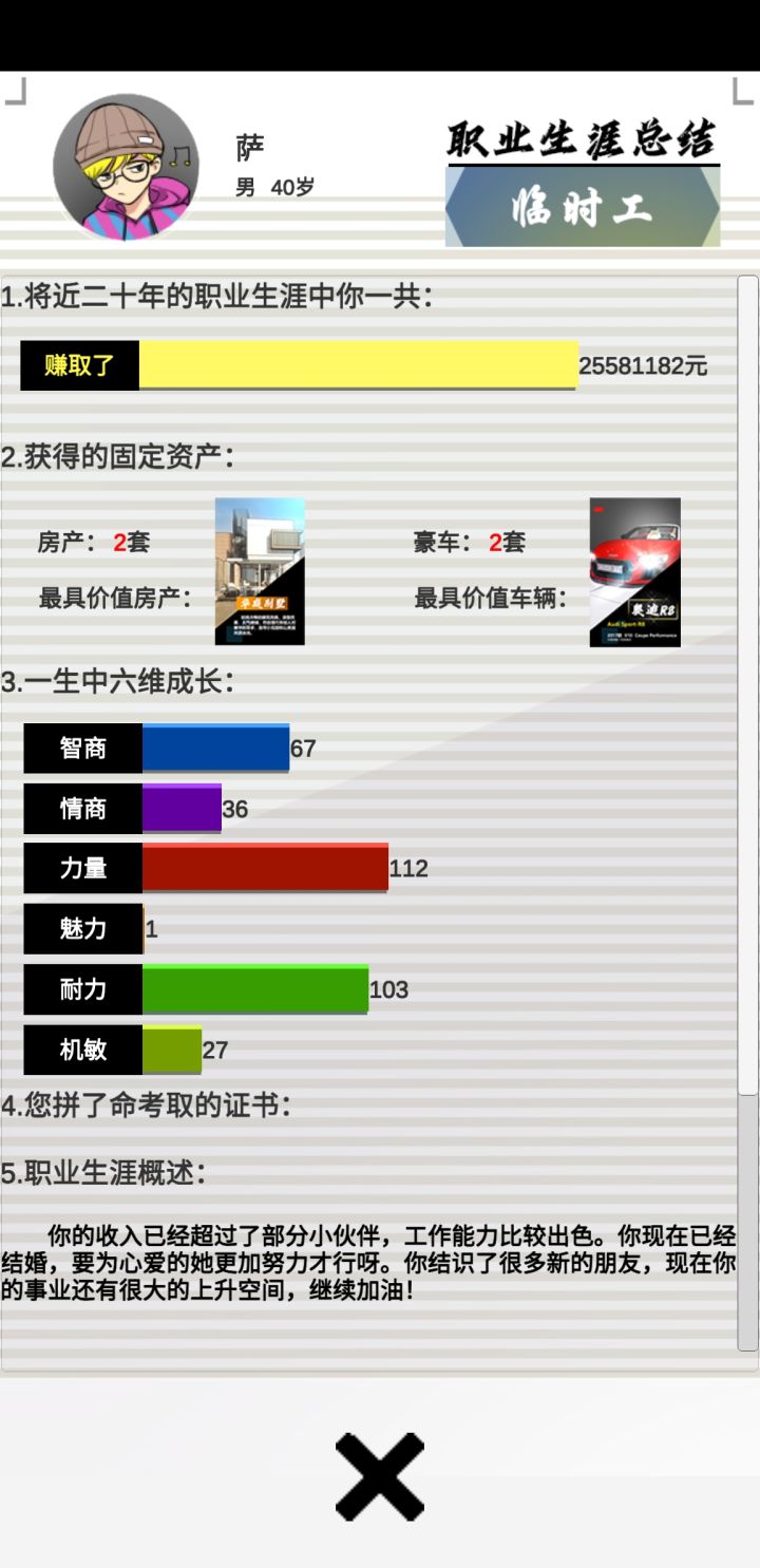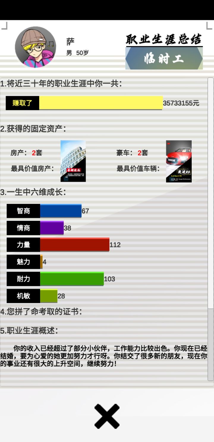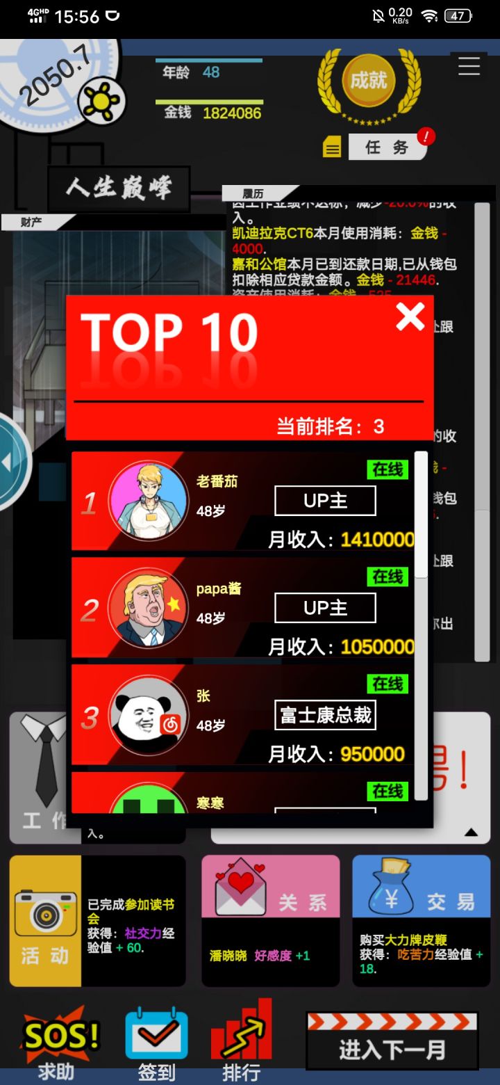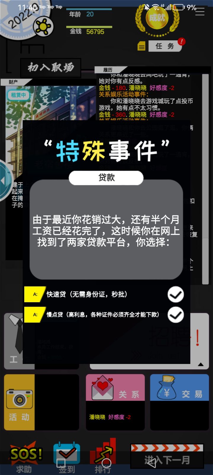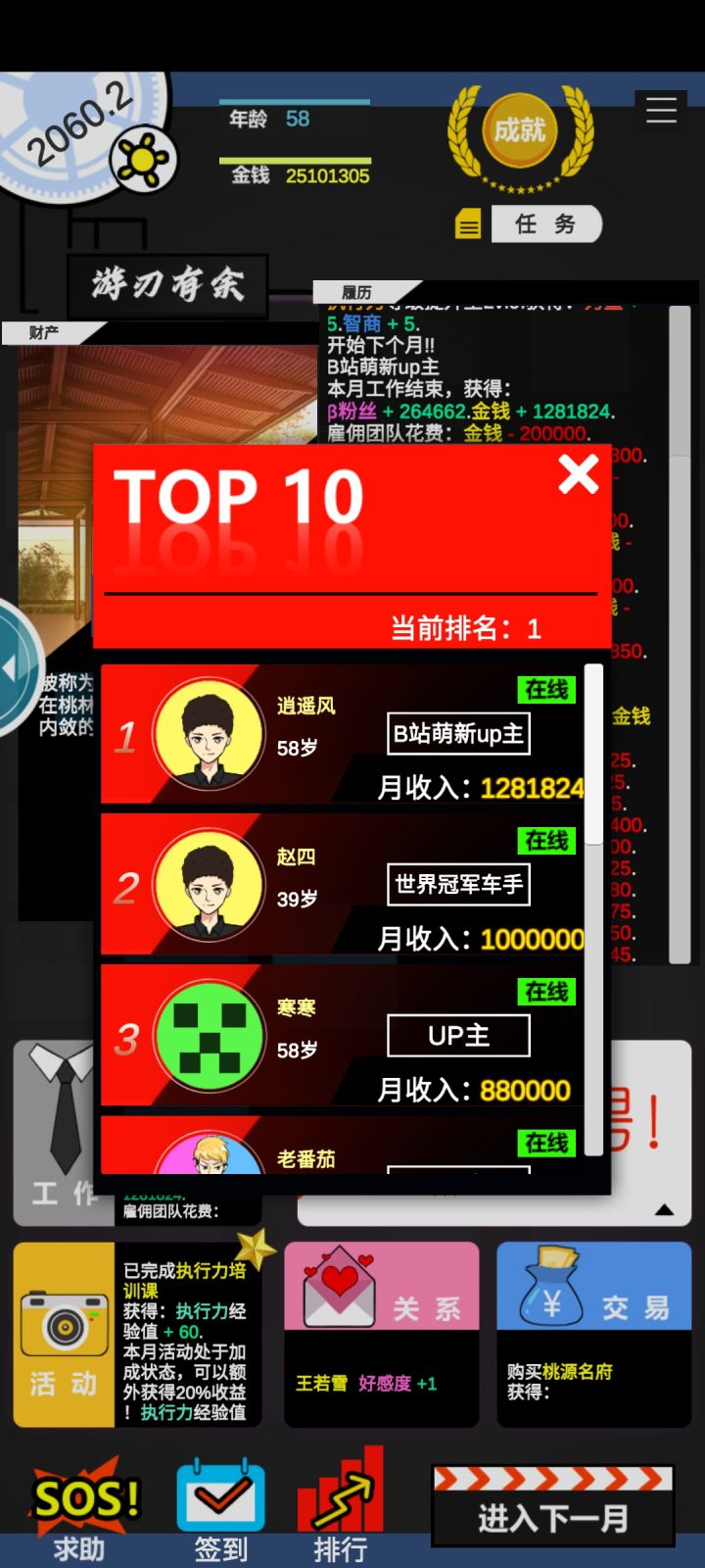 一个小时摸懂了游戏玩法一晚上玩通一次35岁提前退休 随机任务真的恶心 不切实际 好感度随机 很恶心 每天就是活动,隐藏活动,关系,商城买三个刷新买三个刷新买三个下一月手已经废了 总算玩明白了,希望优化一下随机事件,睡觉晚安各位 不懂的留言看到回复