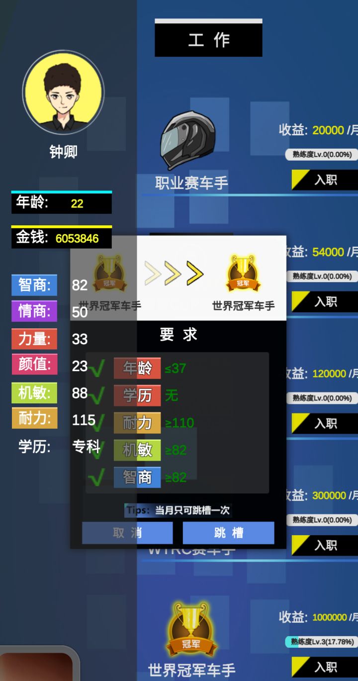 这个游戏挺容易让我上瘾,看着他们一下子就几十万就排上富豪榜前10,我还是月薪才3000的穷小子。我狠下决心,看广告,最后把属性拉起来。这里我告诉大家一个攻略,迅速上富豪榜前10,首先找到《像素风赛车公司》,直接找1百万的月薪职业入职。但这个前提得满足他们的属性。这个就得刷广告了,因为这个职业不需要文凭,不需要工作经验。我前面就掉坑了,大家可以19岁就可以月收入百万了。