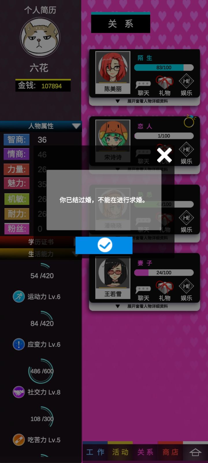 一个小时摸懂了游戏玩法一晚上玩通一次35岁提前退休 随机任务真的恶心 不切实际 好感度随机 很恶心 每天就是活动,隐藏活动,关系,商城买三个刷新买三个刷新买三个下一月手已经废了 总算玩明白了,希望优化一下随机事件,睡觉晚安各位 不懂的留言看到回复