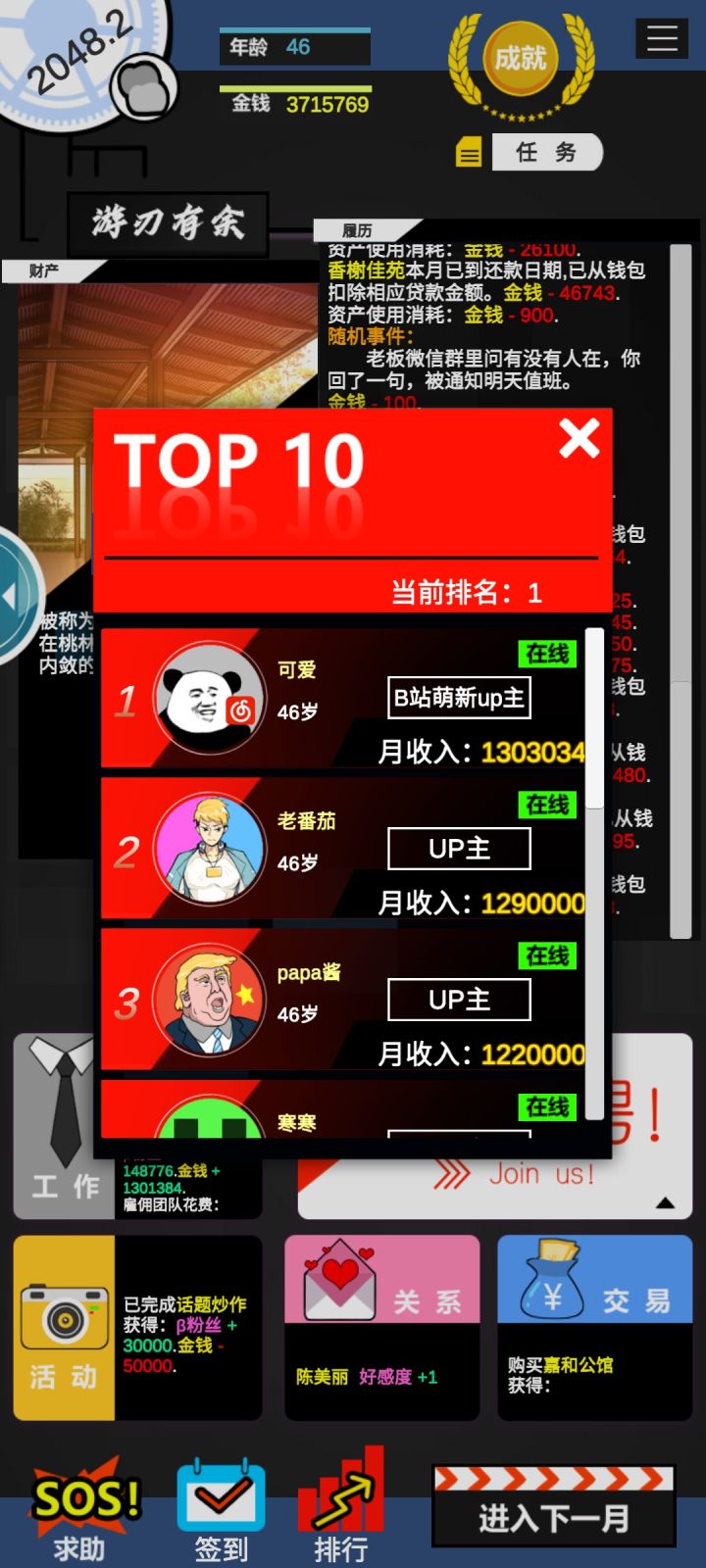 一个小时摸懂了游戏玩法一晚上玩通一次35岁提前退休 随机任务真的恶心 不切实际 好感度随机 很恶心 每天就是活动,隐藏活动,关系,商城买三个刷新买三个刷新买三个下一月手已经废了 总算玩明白了,希望优化一下随机事件,睡觉晚安各位 不懂的留言看到回复