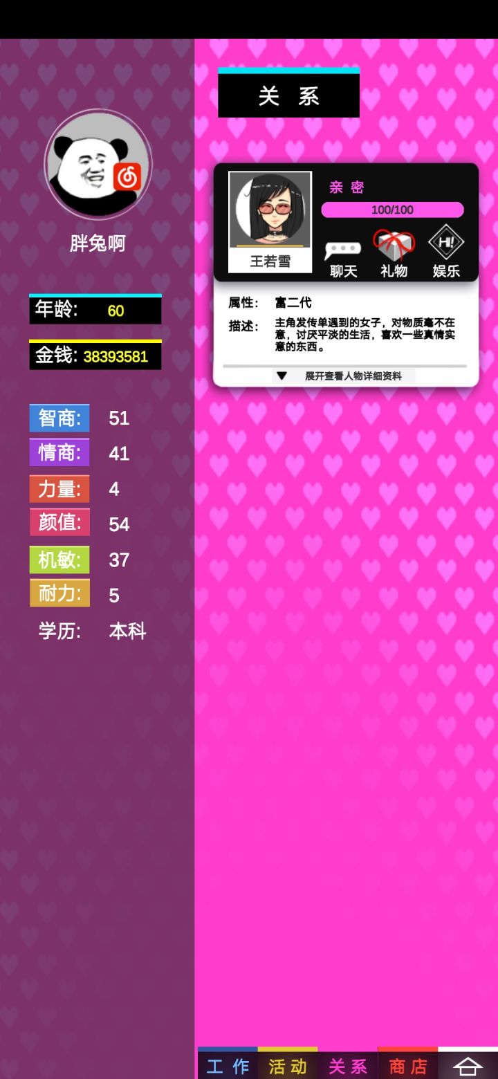 一个小时摸懂了游戏玩法一晚上玩通一次35岁提前退休 随机任务真的恶心 不切实际 好感度随机 很恶心 每天就是活动,隐藏活动,关系,商城买三个刷新买三个刷新买三个下一月手已经废了 总算玩明白了,希望优化一下随机事件,睡觉晚安各位 不懂的留言看到回复