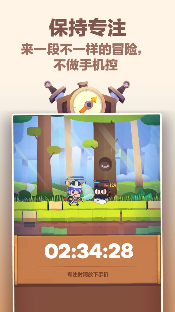 《时间大冒险》是一款以”放下手机的时长“来驱动的RPG游戏,专注的每一分钟都将强化你的英雄,拯救专注王国!我们想要通过游戏的趣味和黏性帮助你培养”放下手机“的习惯!
