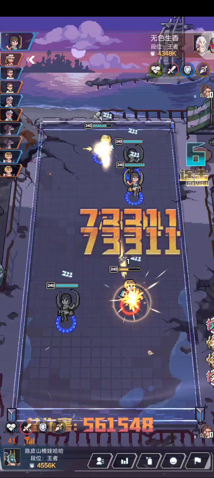 顺序:索尔,尤弥尔,后羿,愚公,女娲 思路:索尔后羿主输出,尤弥尔生存,愚公提供额外的连击,女娲回血 优点:伤害持续,生存容易 缺点:爆发不够,可以把愚公女娲换掉,走一波流