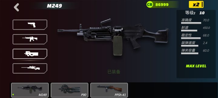 下游戏体验了一下,先直接说优点:足够休闲,很适合没事做不知道干啥时拿出来打打靶子,音效做的也还不错,很解压。玩法很简单,就是单纯的打靶,体验不同的枪械,枪械类型有手枪、步枪、冲锋枪、狙击枪。但解锁枪械需要点数购买,点数需要每关完成后获取,看广告的话则能翻倍获取。游戏里有枪械库,可以查看所有枪械,并进行购买和升级。升级就是很单纯的增加属性,不能添置额外配件进行外观更改,这点有点无聊,如果能加入配