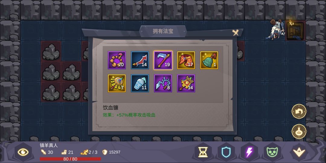 秘籍金钱。圆满7闪避。墓碑:攻击等级,行动上限,攻击等级,行动恢复,行动恢复!!打法如下: 开局先拿一点流尘剑保证前9关不死。然后9层所有能卖的都卖凑齐圆满(这里没钱没雷锤不建议控血,除非你圆满就是雷锤)。然后艰难的过了第10关boss,这就开始起飞了。随便浪到14层。所有没用的都卖。全买雷锤,然后控血(脚边召唤僵尸,然后点击僵尸,召唤点击召唤点击直到雷锤触发。),接下来就是想死都死不掉的玩了(千万不要手残去复制装备和吃血池,我就是经常点这两个导致猝死)~~无脑起飞