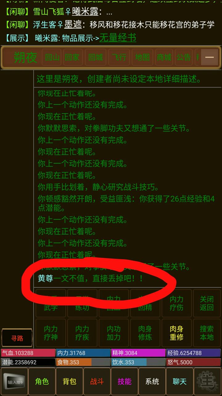 我玩了三个月了,因为我一开始没有在意,也没有加群,一切都是自己慢慢摸索。不知道怎么玩,看到聊天记录里是玩家在冲脉,我以为是要修炼肉身,我开始了修炼肉身,潜能就白白的浪费了……后面我知道了要先拜师练武,因为没潜能学习→删档重来拜什么师好呢?纵观金庸群侠小说,明教的张无忌似乎是很强,加入了明教,因为不知道怎么玩,拜师进度很慢,等我遇到张无忌,已经没有潜能了,无忌的绝世神功也没学到。没关系,我可以慢慢
