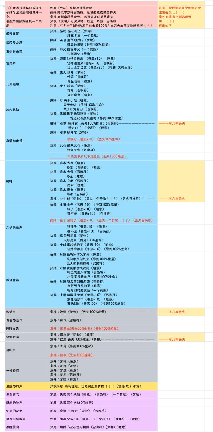 【洄魂梦境】选项攻略表格(完结版1.0)