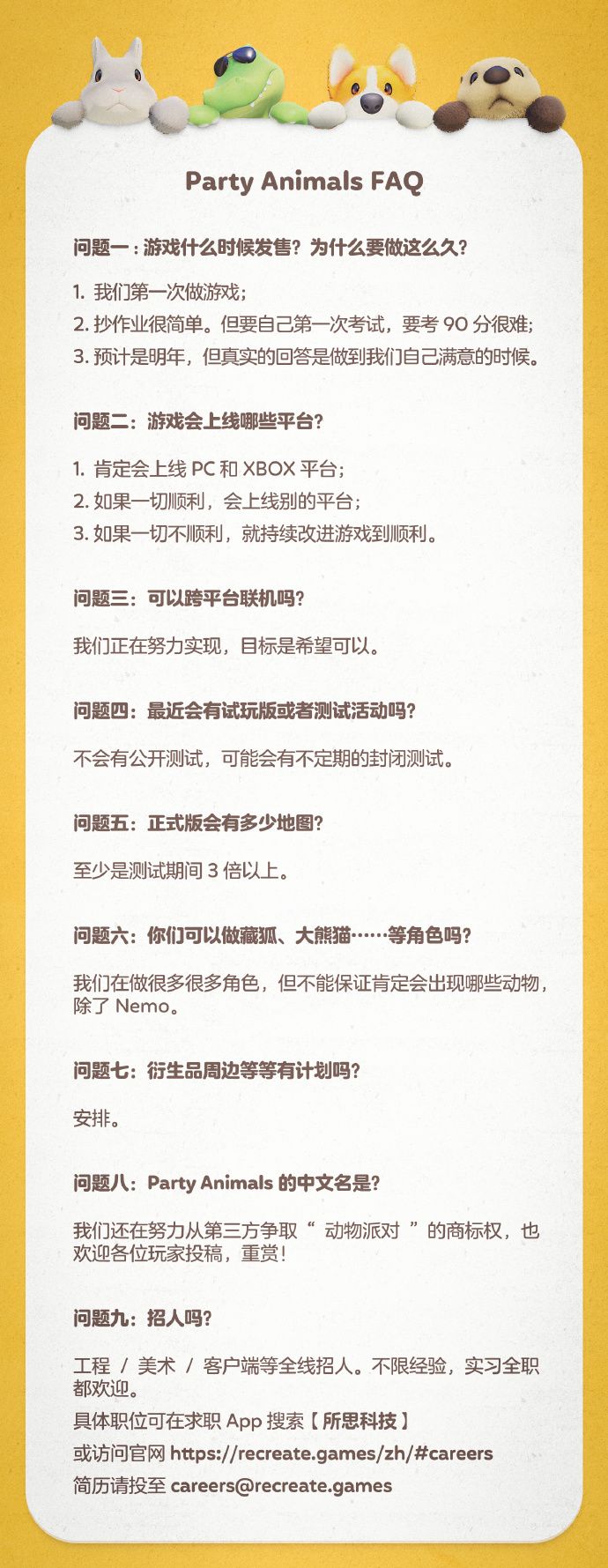 《动物派对》公布了第一期,并宣布将从这个⽉开始,⾄少每个⽉公布⼀些游戏研发的进度,以及回答⼀些玩家的问题: ⾸先⽬标发售时间希望是在2022年内,有可能会因为质量和合规性审批⽽导致延期。 在这两年⾥,从动物⽑发,地图样貌,⻆⾊物理系统,⾳频系统,UI 系统等等,⼏乎所有东⻄都翻新重做了⼀次。 在之前11个可爱⼩动物的基础上,还会有更多动物,最终⽬标是将所有熟知的各种动物都囊括在这个动物宇宙中。 其