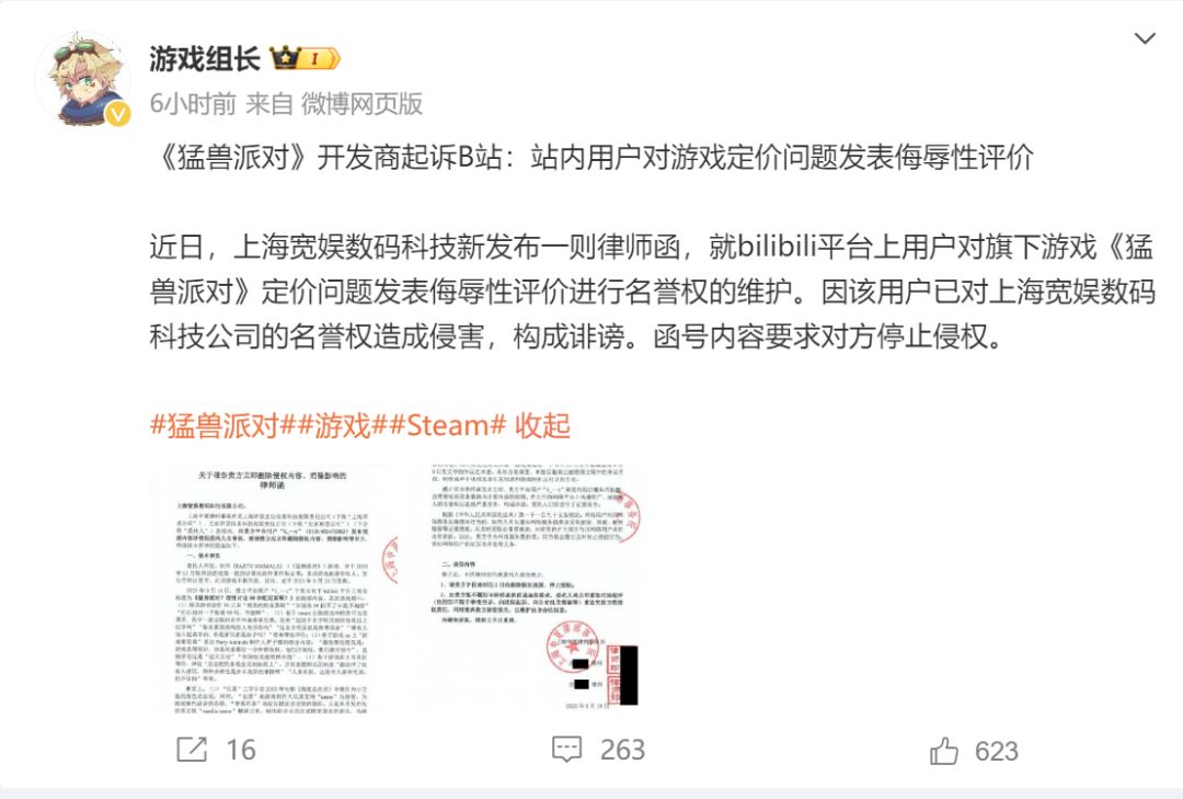 【瓜】《猛兽派对》开发商向B站用户发送律师函