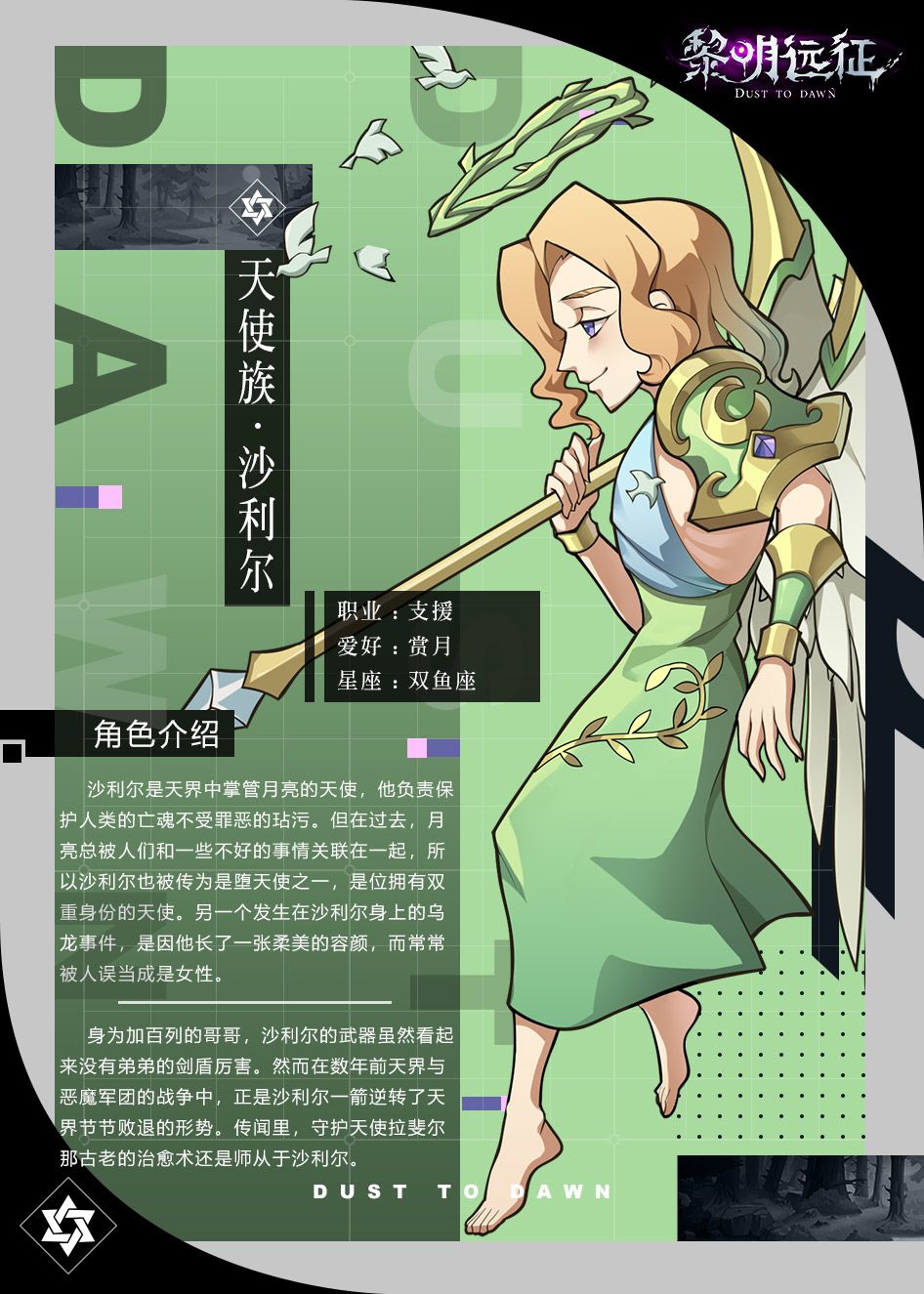 ▌天使族-支援-沙利尔 “生存还是死亡,这是个时间问题” (爱的守护技能展示) 指挥官大人们好呀~!今天塔妹要为大家介绍的是来自天界的沙利尔姐姐……啊啊说错了!是沙利尔哥哥!他不仅长相柔美,就连性格也十分温柔,会为小队中的所有成员疗伤,他的大招还可以复活队友哦! 1技能:爱的守护 沙利尔释放不朽之爱,为血量最低的3名队友恢复部分血量,持续4秒。 群体回血 2技能:爱与恨 沙利尔向前方发射一条射线,