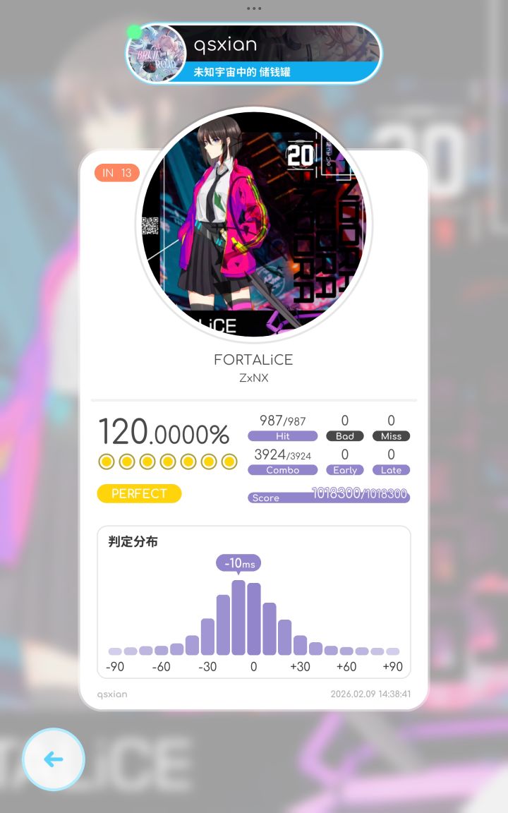谱面整体很优秀,而且全屏判定我个人感觉可玩性很强,玩起来很休闲()而且一种配置感可以拆出很多手法的,很有趣味性!反正光看着就很好玩……(判定其实问题很小很小,bad爆太多建议流速调高一点)