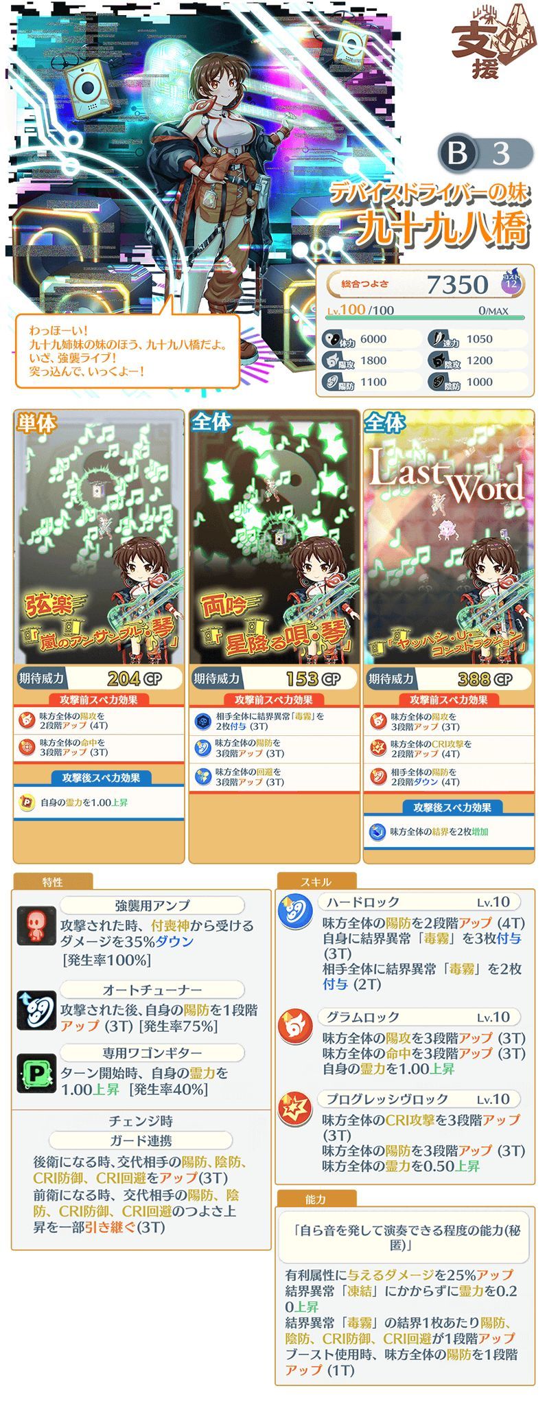 出了有一段时间了 也是B3世界线, 支援式超限, 面板还行, 也是阳拐, 拐力还是比较强的, 符卡和技能都有相当不错的全体拐,可以和之前的幼神妈相比了 单体小卡: 特攻主幽灵 硬质,60%、60%、70%、80% 全体阳攻命中,自身1p 全体小卡: 特攻主灵魂和人类, 硬质,60%、70%、70%、80% 全体3毒,技能给2,3p破盾, 全体阳防回避 自身起手只有2p,全体卡破盾要3p, lw: 特