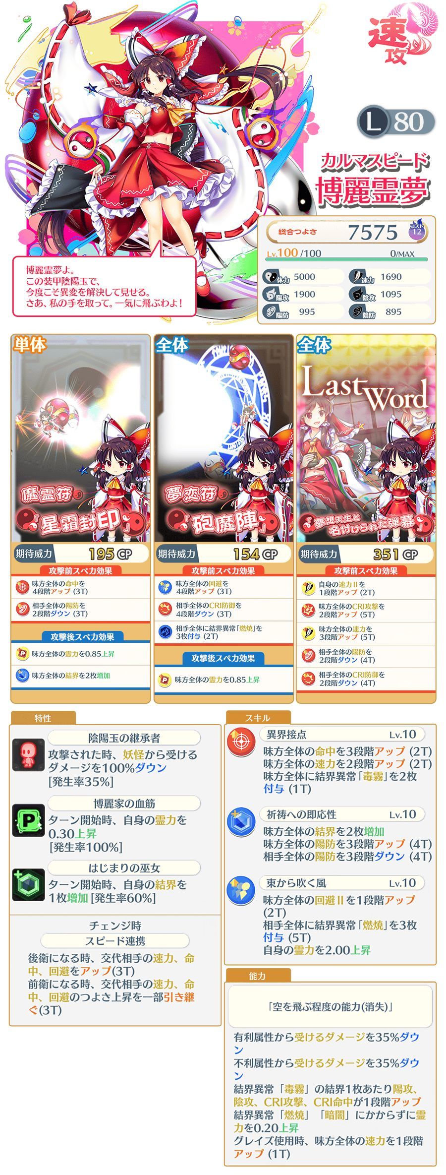 泳装华扇 支援式贵限 1800的阳攻在贵限中偏低,速力给了1450,打斩裂的话看补正了, 技能模组算是可以的,缺点是cd实在过长(不过cd这玩意在复灵周回的时候4t和8tcd都是一样的) 全体阳攻II2段,上一个有全体阳攻II的是没什么存在感的MV美玲, 减技能cd其实在复灵周回的时候有用但不多, 有利增伤给了40%, 缺点是结界异常,不给阳攻..然后不免冰! 此外自上结界能力比较少,而且开盾没有