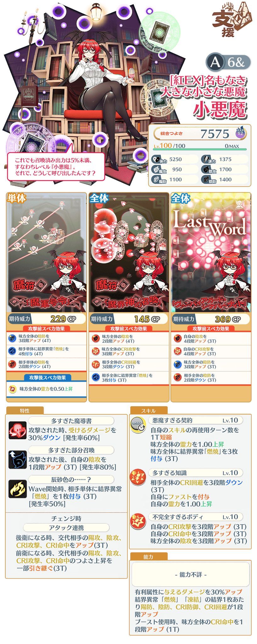 [红EX]小恶魔 支援式ex限 A6&世界线 打阴,但是这面板全看补正是吧,速度给的很多,但是没有斩裂,纯纯是给你调速用的, 技能,自身的技能cd缩短1T,想不出来占这个位置是想干嘛,1技能6cd,2技能5cd,3技能3cd,就单纯的把3技能的3cd减到2,在3t的作业中能开两次... 剩下的拐都很常规, 有利增伤30% 单体小卡: 特攻:16段,妖怪、人类、异变解决者、红魔馆、巫女、魔法使, 3