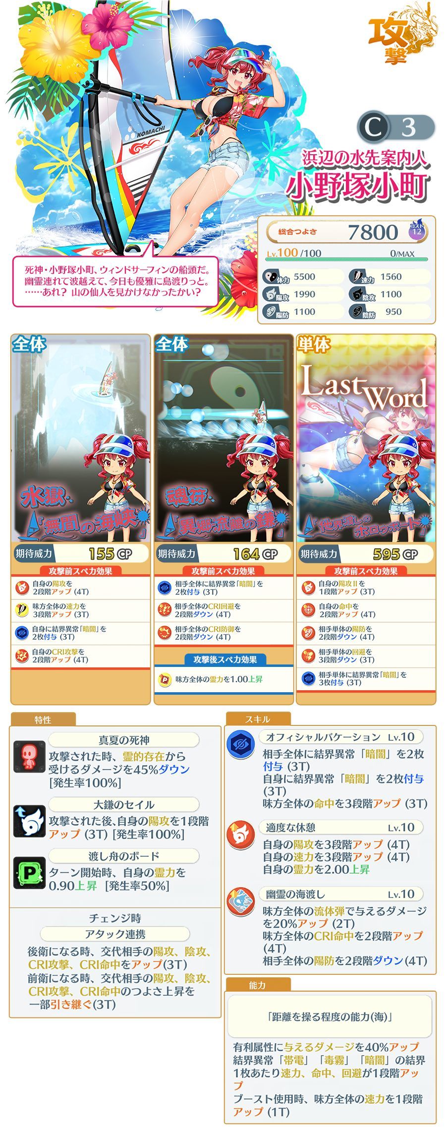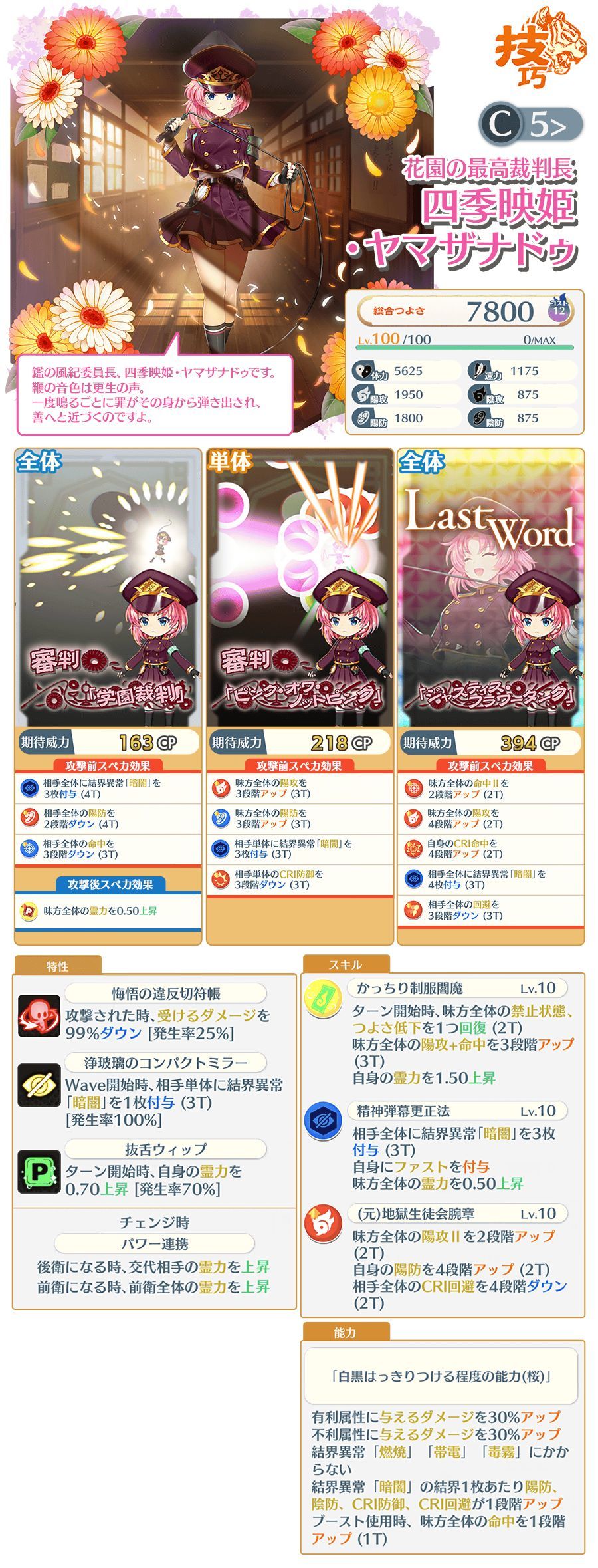 樱四季 技巧式贵限 C5>世界线 打阳,1950阳攻,1800阳防,面板给的很足, 技能又双叒叕一个全体阳攻II.... 算上上一期的水神子一共有4个全体阳攻II了.... 全体单解锁,特定情况下有用, 有利增伤30%, 全体拐是阳攻和命中, 结界激昂给的防御,开p也只给命中, 全体小卡: 特攻:1段:春、学生服、不死族、鬼、仙人、神格, 36段:地狱、冥界、天界, 4段:春、学生服、灵魂、教师、