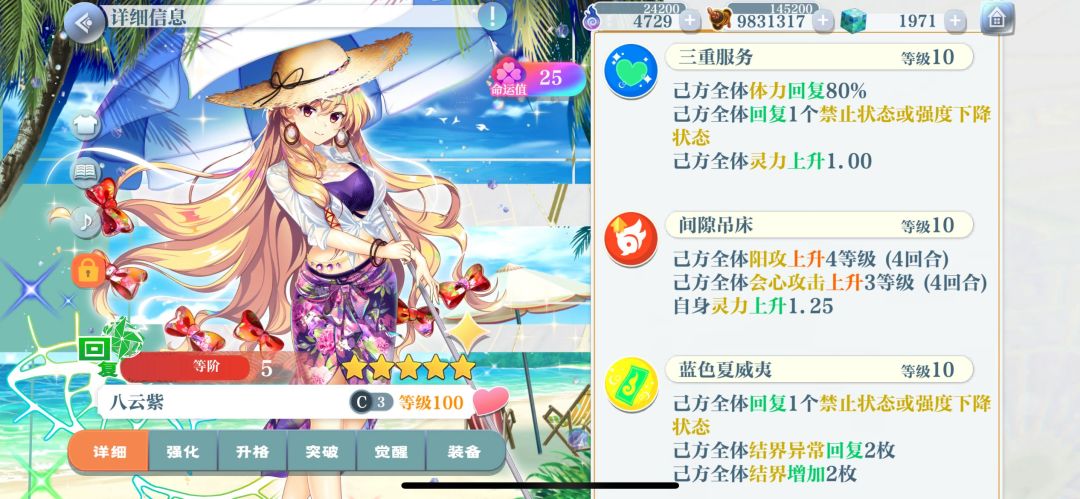 泳装秦心 妨碍式贵限, 妨碍式也算是很长一段时间没出过贵限了,上一个贵限是泳装芙兰,上一个MV限是国服刚出的MV恋恋, 先看面板,很明显基础阳攻给的实在是太少了,连1700的a限面板都没到,速度倒是很慷慨的给了和阳攻一样的1650,那么具体如何就和MV帕秋莉一样看看白字和补正了, 然后是技能模组,作为一个干扰式,映入眼帘的是降全体阳防II2段!完全不亚于全体阳攻II2段的数值, 但是,除此之外的降