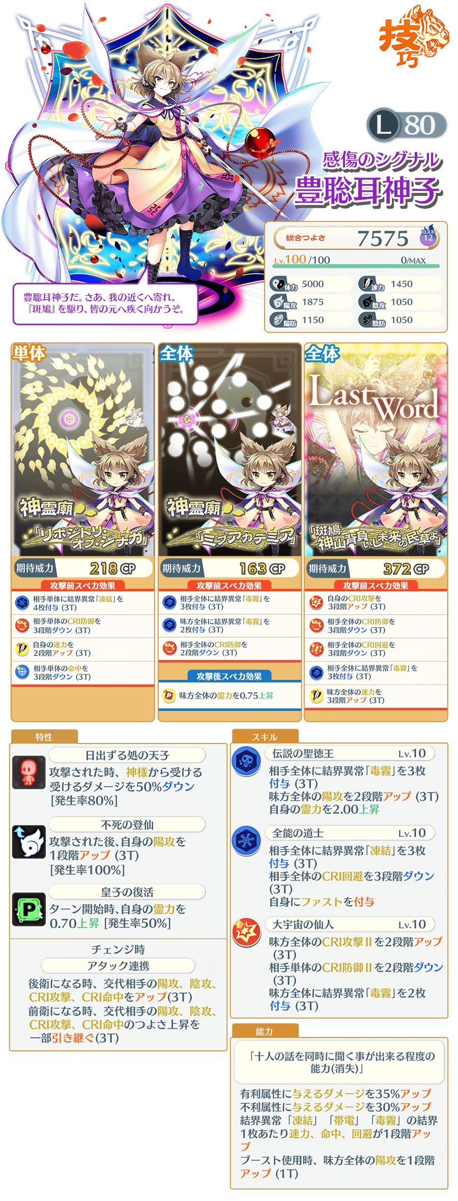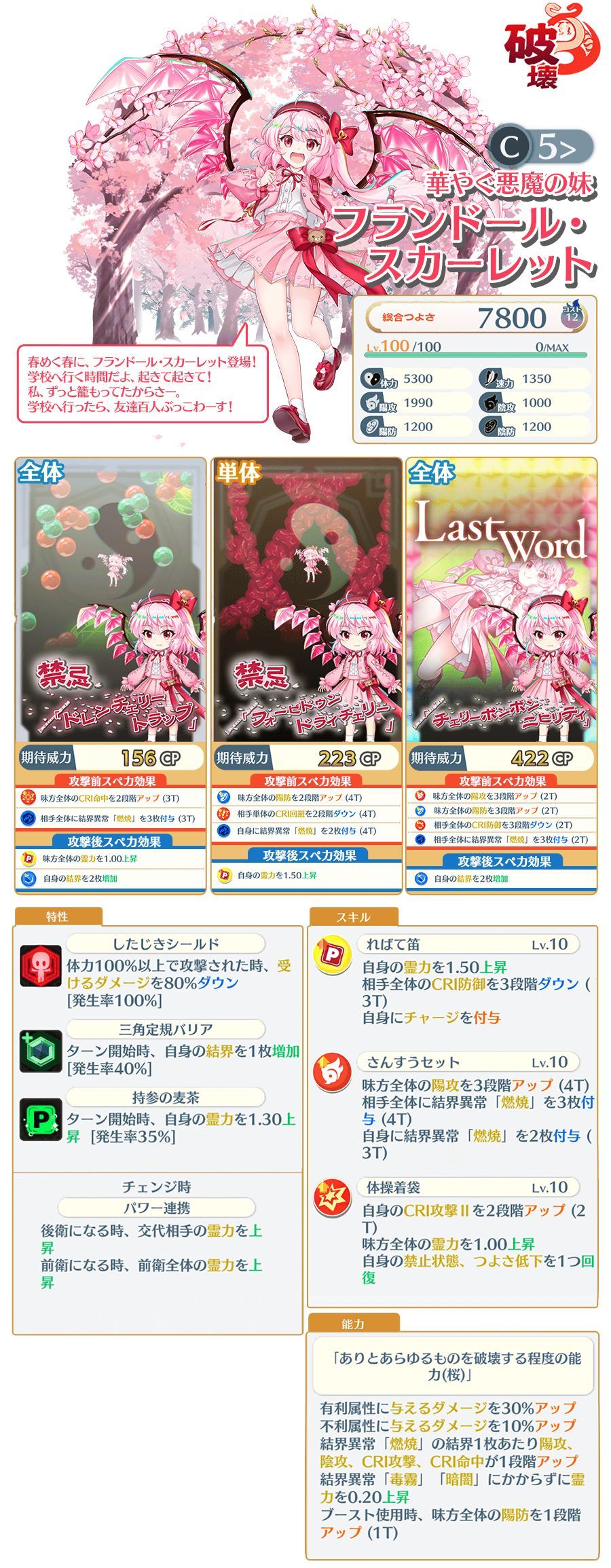 樱芙兰 破坏式史诗限 C5>世界线 所谓C5>,和C的夏世界所对应,C>是春,C<是秋,C=是冬。 所以和夏的大海和泳装对应,春天就是樱花了。 面板近2000的阳攻, 1技能只给1.5p, 想3p起手还得把3技能交了, 自身会心攻击II2段,那么问题来了,基础的会心攻击I从哪来, 除了结界异常的buff还真没有, 全体阳攻, 降对方全体会心防御, 有利增伤30%, 全体小卡: 特攻:主人、命莲寺、