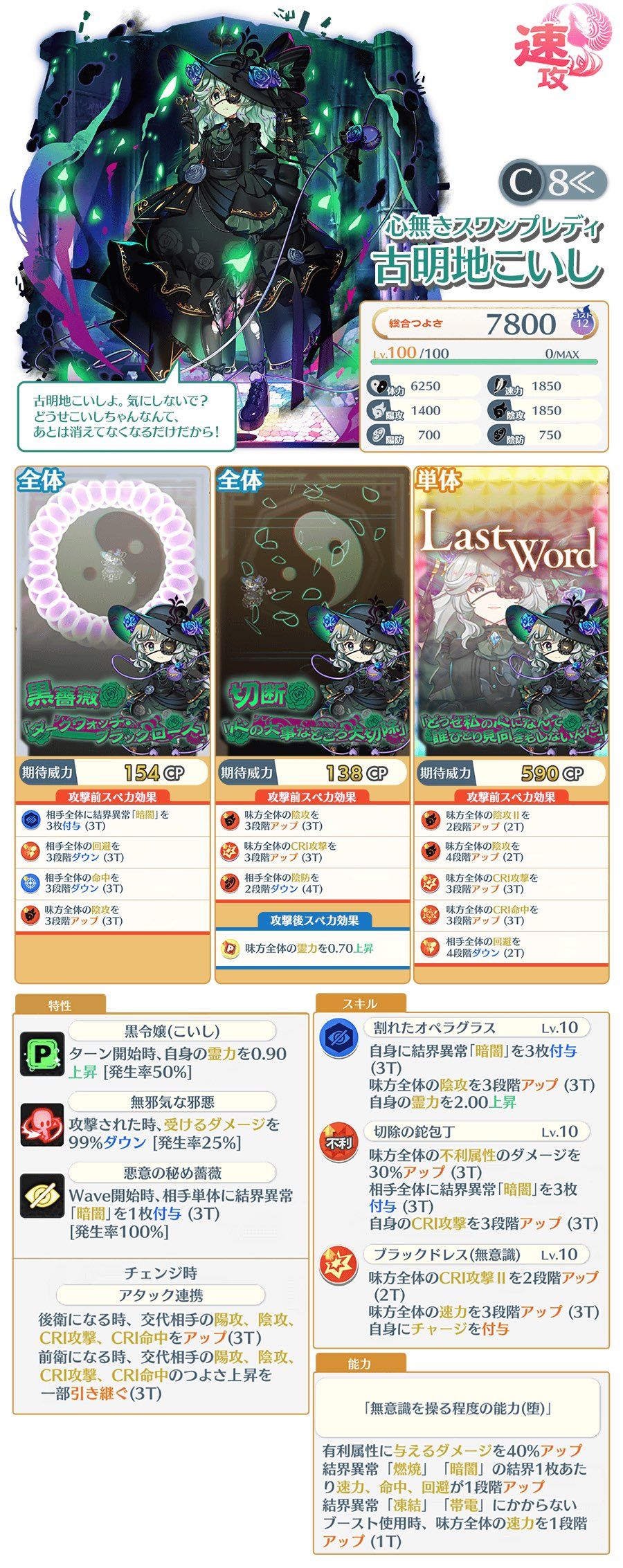 干扰式EX限 A19&世界线,新作的居然 打阳,1800速的面板,但是阳攻只有1700, 技能降会心防御II1段, 常规的降阳防3段,会心防御2段,不算多 有利增伤30% 单体小卡: 特攻:宗教家、兽、妖兽、动物灵,妖怪、神格、妖怪山, 斩裂:40%*3, 单体降防,不看了, 全体小卡: 特攻同上, 斩裂:40%*2+50%, 全体3电,技能给3,3p破盾 降防2段,会心回避3段, lw: 这属性