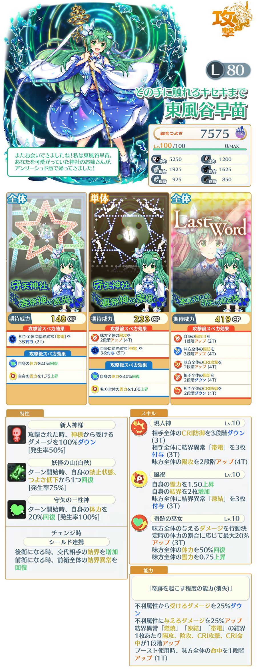 先把上周的留存给写了 [绀-完美无缺EX]早苗 早苗的又一个EX限 技巧式EX限 A15A&世界线 打阳,1750阳攻 1750阳防, 全体结界异常毒+电一共5枚, 蓄力buff是不利增伤40%, II阶buff是回避II2段..... 自身自带40%不利,高达80%的不利增伤还是有点东西的, 但是除此之外的基础buff只能用灾难来形容, 全靠小卡预热,但是即使小卡预热了还是缺buff, 全体小卡