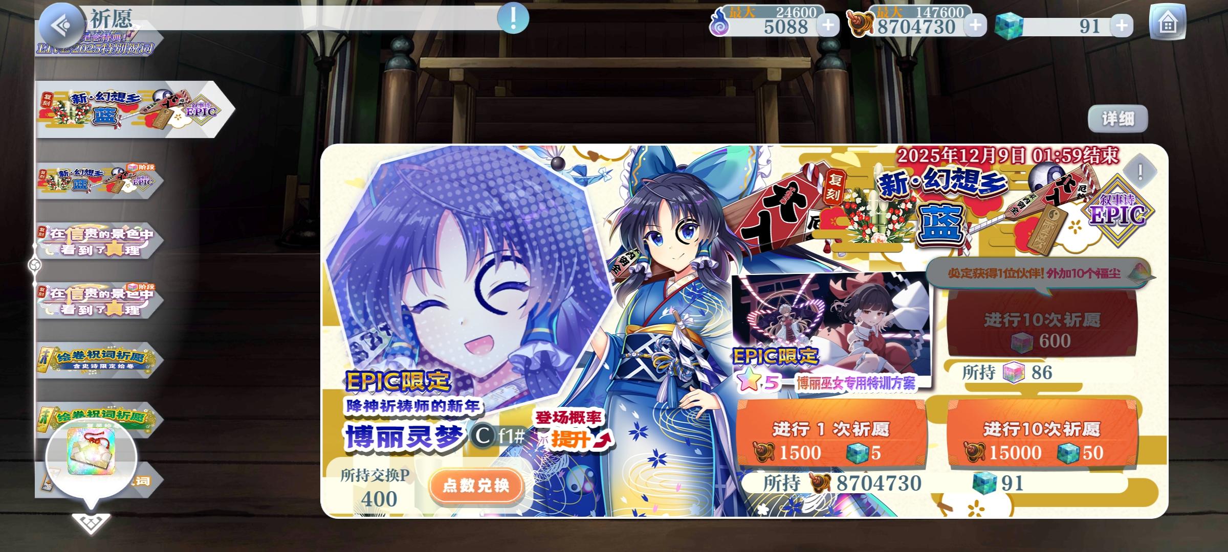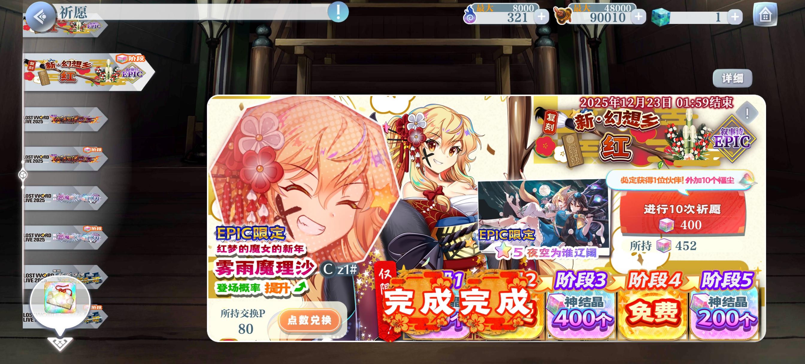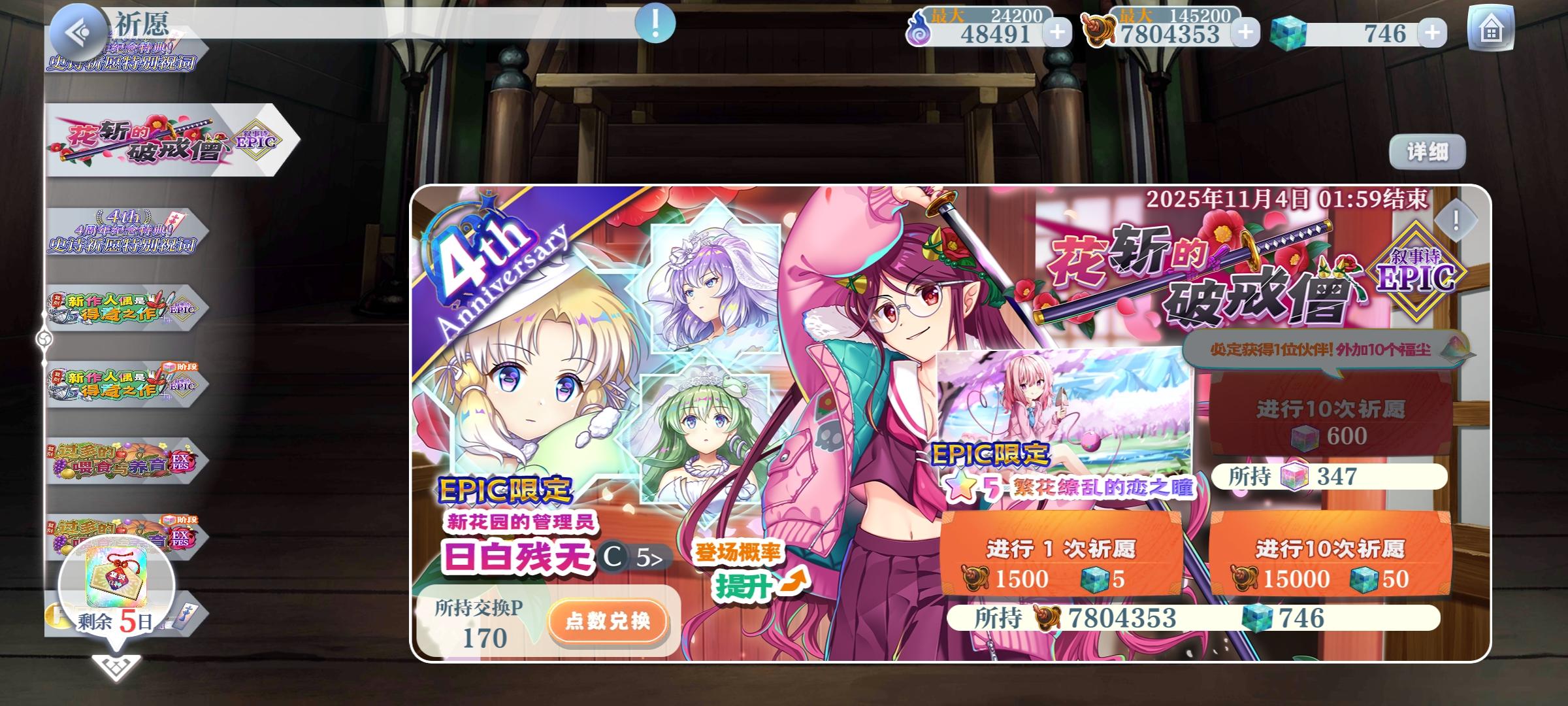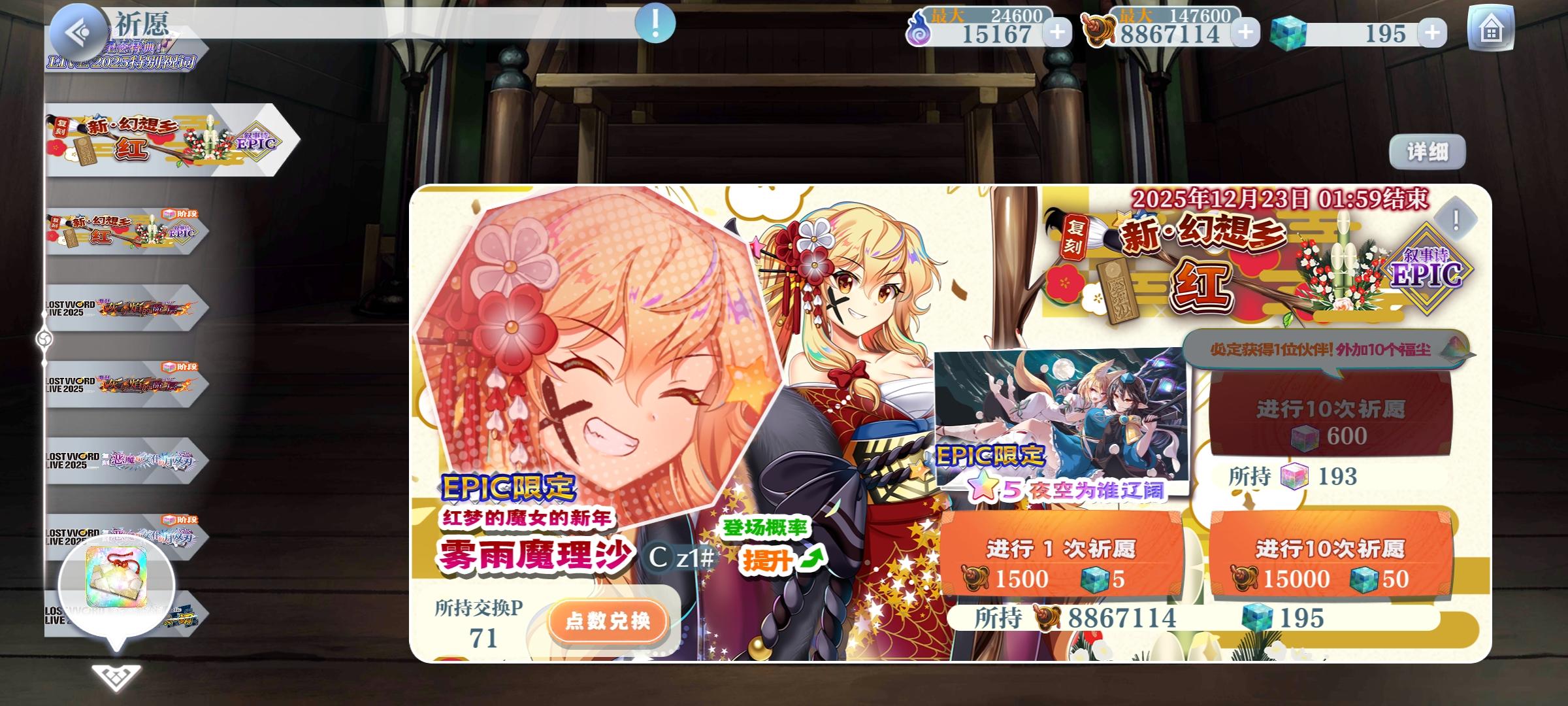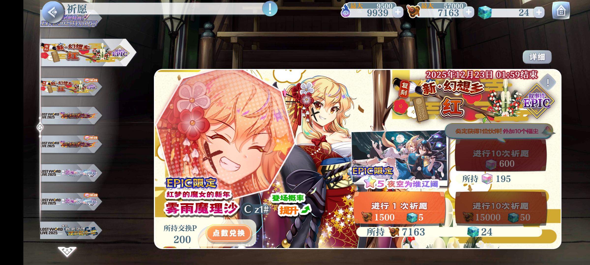 其实垫了70发的,然后突发奇想不想点十连了,就一发入魂了概率学,真是奇妙呢总之大致总结一下最近半年的抽卡记录吧!水苗:180抽出一个,430抽出一个,然后换一个收手大(翅膀)苗:80抽出巫女桥姬复刻:如井(240抽出)樱赫卡:怒吃一井白蛙:(仅有)30抽蓟县出货,最后一个十连是让舍友帮忙抽的(他问我“新”是什么意思)魔小铃:190抽出樱残