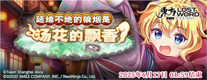 亲爱的乡民们!最新一期活动预告来袭~快来与我们一起参与吧~ 【延绵不绝的狼烟是汤花的飘香】「延绵不绝的狼烟是汤花的飘香」为剧情探索活动。活动期间会开放活动剧情关卡,通关活动关卡可以收集活动点数。活动点数可在交换所兑换(道具素材)、活动幸运抽奖(道具素材)、点数累计奖励(道具素材)中使用。 开始日期:2025年6月3日 02:00结束日期:2025年6月17日 01:59 【