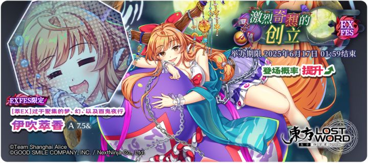 【激烈奇想的创立 EXFES】[萃EX]过于聚集的梦、幻、以及百鬼夜行 伊吹萃香登场概率提升的EXFES限定祈愿!开始日期:2025年6月10日 02:00结束日期:2025年6月17日 01:59 ※「[萃EX]过于聚集的梦、幻、以及百鬼夜行 伊吹萃香」是仅在EXFES限定祈愿中登场的角色。※「激烈奇想的创立 EXFES」中需要交换P350才能交换「[萃EX]过于聚集的梦、幻、以及百