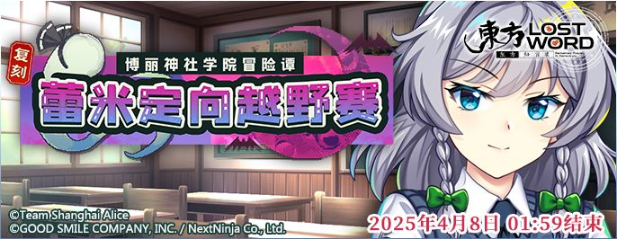 亲爱的乡民们!最新一期活动预告来袭~快来与我们一起参与吧~ 【复刻 博丽神社学院冒险谭 蕾米定向越野赛】「复刻 博丽神社学院冒险谭 蕾米定向越野赛」为剧情探索活动。活动期间会开放活动剧情关卡,通关活动关卡可以收集活动点数。活动点数可在交换所兑换(道具素材)、活动幸运抽奖(道具素材)、点数累计奖励(道具素材)中使用。 开始日期:2025年3月25日 02:00结束日期:2025年4月