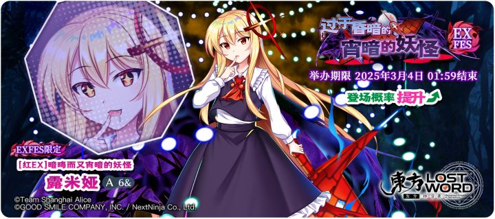 【过于昏暗的宵暗的妖怪 EXFES】[红EX]暗晦而又宵暗的妖怪 露米娅 登场概率提升的EXFES限定祈愿!开始日期:2025年2月25日 02:00结束日期:2025年3月4日 01:59 ※「[红EX]暗晦而又宵暗的妖怪 露米娅」是仅在EXFES限定祈愿中登场的角色。※「过于昏暗的宵暗的妖怪 EXFES」中需要交换P350才能交换「[红EX]暗晦而又宵暗的妖怪 露米娅」。※「[红