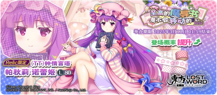 【至高的魔导书是不会移动的 Relic】(TT)钟情言语 帕秋莉·诺蕾姬 登场概率提升的Relic限定祈愿!开始日期:2025年3月4日 02:00结束日期:2025年3月11日 01:59 ※「(TT)钟情言语 帕秋莉·诺蕾姬」是仅在Relic限定祈愿中登场的角色。※「至高的魔导书是不会移动的 Relic」中需要交换P350才能交换「(TT)钟情言语 帕秋莉·诺蕾姬」。※「(TT)