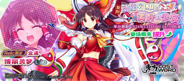 【FIND THE VVORDS 〜梦想 EPIC】[LostWord LIVE 2024]博丽灵梦登场概率提升的EPIC限定祈愿!开始日期:2024年12月3日 02:00结束日期:2024年12月17日 01:59 ※「LostWord LIVE 2024 博丽灵梦」是仅在EPIC限定祈愿中登场的角色。※「FIND THE VVORDS 〜梦想 EPIC」中需要交换P400才能交换