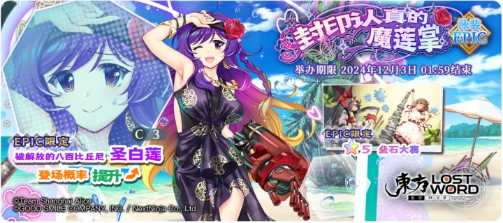 【封印认真的魔莲掌 EPIC】[被解放的八百比丘尼]圣白莲特登场概率提升的EPIC限定祈愿!开始日期:2024年11月19日 02:00结束日期:2024年12月3日 01:59 ※「被解放的八百比丘尼 圣白莲」是仅在EPIC限定祈愿中登场的角色。※「封印认真的魔莲掌 EPIC」中需要交换P400才能交换「被解放的八百比丘尼 圣白莲」。※「封印认真的魔莲掌 EPIC」中需要交换P50
