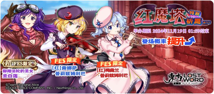 【红魔塔特别祈愿 超FES】[红]露娜萨·普莉兹姆利巴、[红]梅露兰·普莉兹姆利巴和圣白莲登场概率提升的祈愿!开始日期:2024年11月12日 02:00结束日期:2024年11月19日 01:59 「红魔塔特别祈愿 超FES」会同时开放特惠阶段祈愿!阶段祈愿分为1~5阶段,每阶段都相当于1次神结晶十连祈愿。阶段5必定获得2位角色。 【各阶段消费神结晶】阶段1:神结晶 60阶段