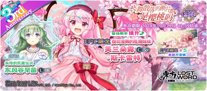 【飞舞散落的断片是樱桃吗 EPIC】[樱花漫舞的恶魔妹妹]芙兰朵露·斯卡雷特登场概率提升的EPIC限定祈愿!本次祈愿中,[失传的荒废仪式 东风谷早苗(L0g)]也将登场!并且,神结晶十连祈愿获得的福尘提升为2倍!开始日期:2024年10月15日 02:00结束日期:2024年10月29日 01:59 ※「樱花漫舞的恶魔妹妹 芙兰朵露·斯卡雷特」是仅在EPIC限定祈愿中登场的角色。※[
