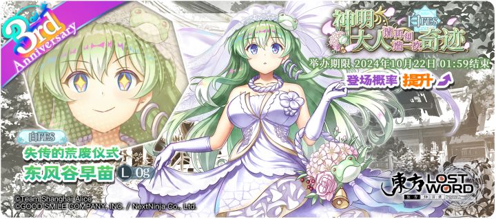 【神明大人请再创造一次奇迹 白FES】[失传的荒废仪式]东风谷早苗(L0g)登场概率提升的白FES限定祈愿!白FES限定祈愿,仅可使用神结晶进行十连祈愿。并且获得的福尘提升为2倍!开始日期:2024年10月8日 02:00结束日期:2024年10月22日 01:59 ※「神明大人请再创造一次奇迹 白FES」中需要交换P450才能交换「失传的荒废仪式 东风谷早苗(L0g)」。※「失传的